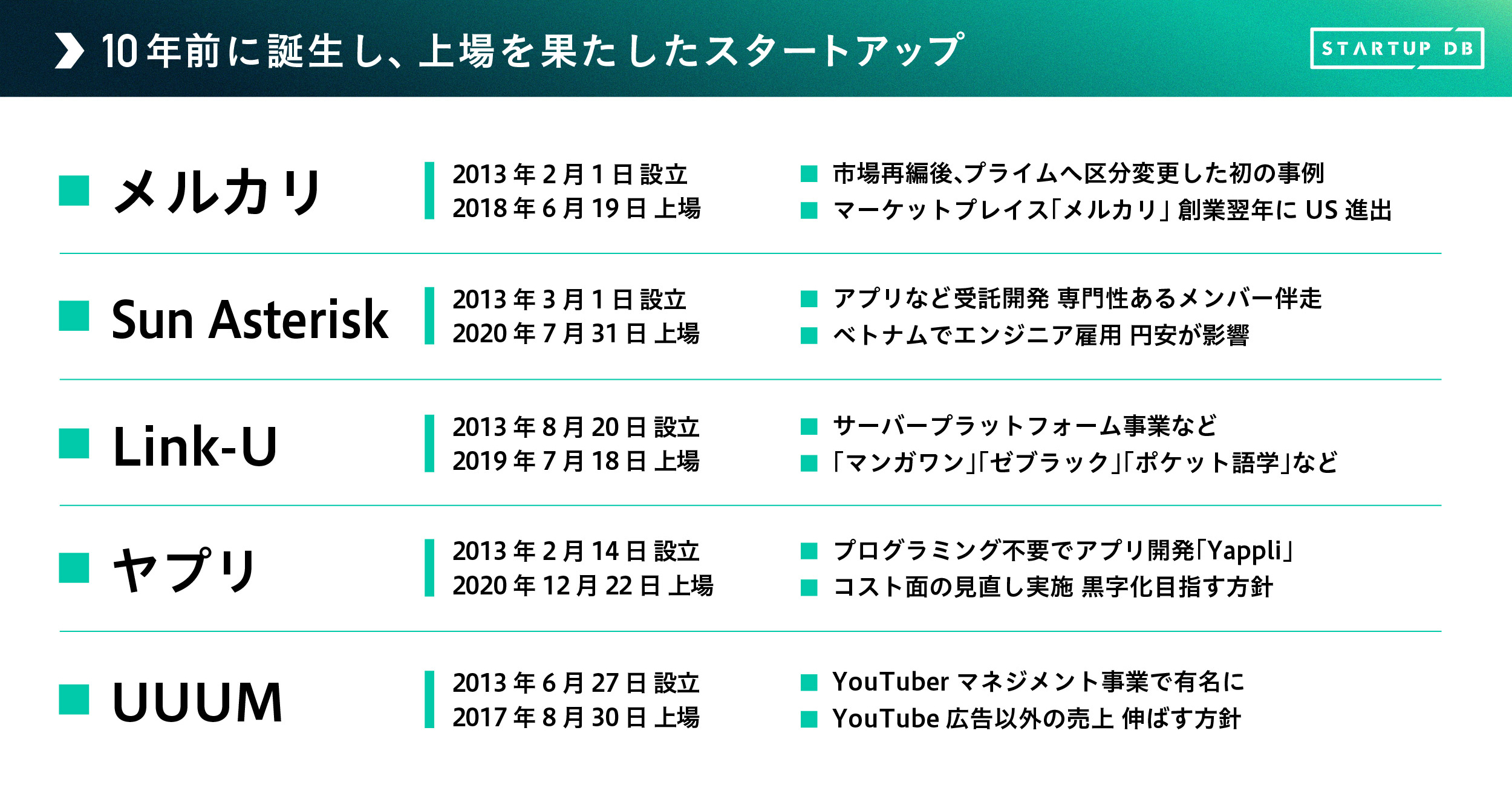 2013年創業のスタートアップは634社。そのうち、IPOを果たしたのは25社だった。代表的な存在はフリマアプリを手掛けるメルカリだ。2018年に東証マザーズ(当時)に上場すると、22年6月にプライム市場へ移行。プライム市場への上場変更が承認されたのは、東証の市場再編後では初の事例だった。