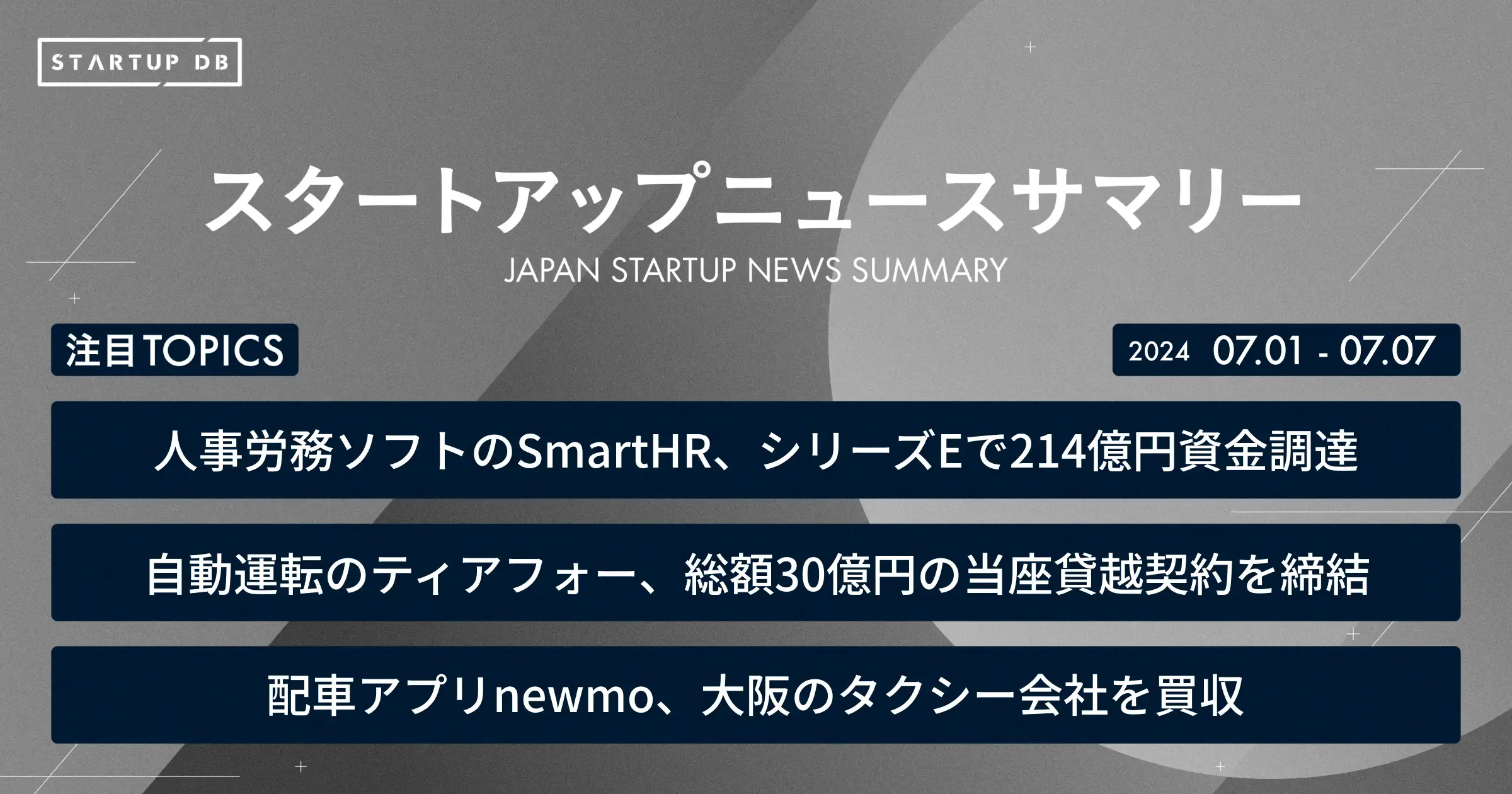 国内の成長産業やスタートアップに関する幅広い情報を収集・整理し、検索可能にした情報プラットフォーム「STARTUP DB」では毎週、スタートアップニュースサマリーを配信している。