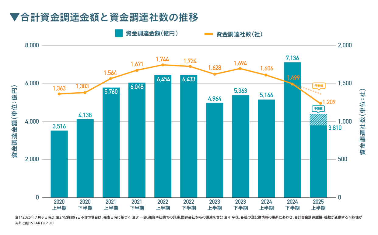 2025年上半期の資金調達金額は速報値で3,810億円で着地し、未だ調達環境が良くなってきているとは言えず横ばいの状態だった。