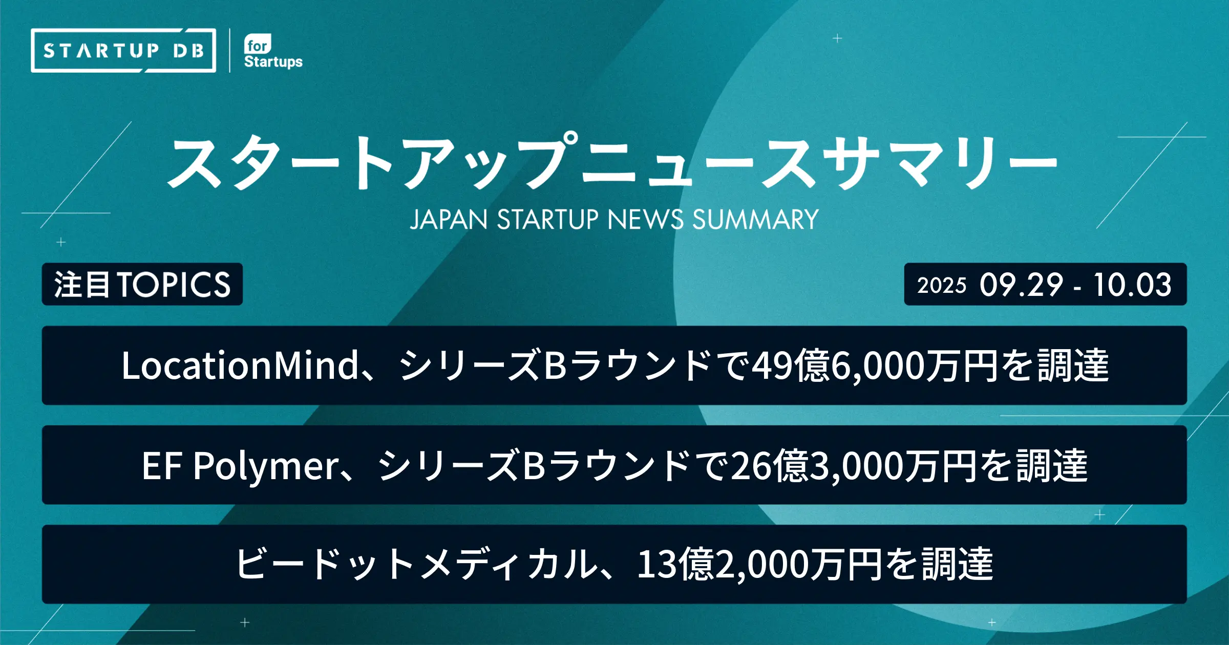 国内の成長産業やスタートアップに関する幅広い情報を収集・整理し、検索可能にした情報プラットフォーム「STARTUP DB」では毎週、スタートアップニュースサマリーを配信している。