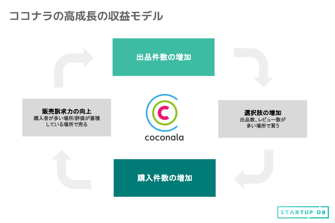 また、出品者は購入が多いと評判のあるマーケットプレイスに集まるため、「ココナラ」でも出品することになり、自分の評価も蓄積しながら出品数を増やしていく。購入者は出品数、レビュー数が多い場所で買うため購入者が増加するという循環によってネットワーク効果が働き、出品者と購入者双方のエンゲージメントが向上する自律的な成長のサイクルが実現されるモデルになっている。