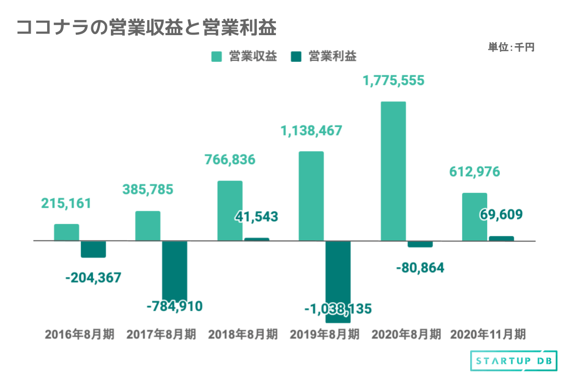 営業利益については上下があるものの、2020年11月の時点で6,960万円の黒字となっている。2019年8月期から2020年8月期にかけての営業損失の主な減少要因は広告宣伝費だが、これはテレビCM放映の規模を縮小したことによる。