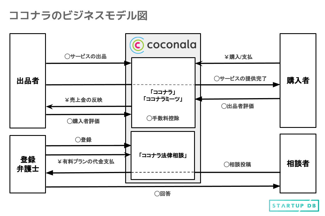 同社は主力サービスである「ココナラ」の他、弁護士への法律相談プラットフォーム「ココナラ法律相談」、ユーザー同士が対面で会ってサービスが提供できる「ココナラミーツ」を展開している。なお、「ココナラ法律相談」「ココナラミーツ」のユーザーIDは、「ココナラ」のユーザーIDと統一・連携して利用できるようになっており、ユーザーの横断的なサービス利用を促進している。