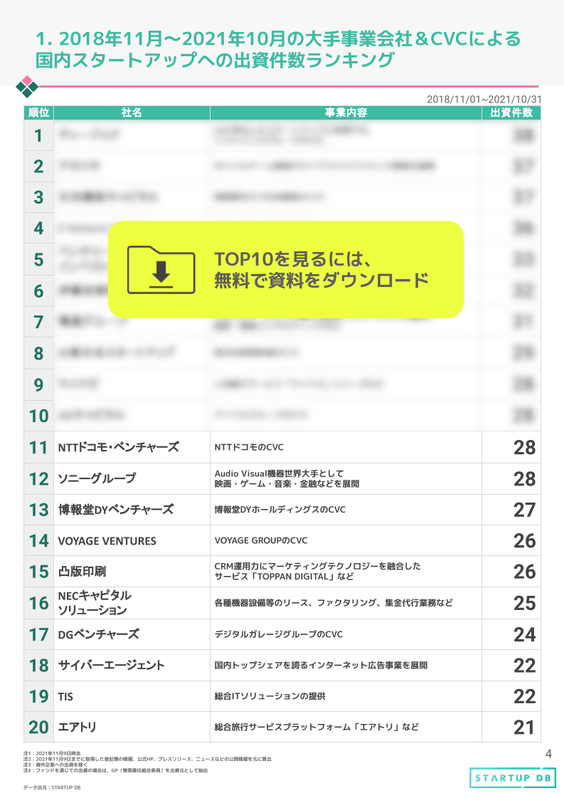 そこで本レポートは、大手事業会社やCVCからスタートアップへの出資件数をランキング化するとともに、2018年11月以降に組成されたファンドをまとめている。さらに、大手事業会社とスタートアップの注目の資本業務提携をピックアップすることで、広がりをみせる両者間の連携・共創に向けた取り組みを紐解いていく。