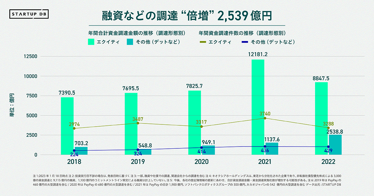 2022年に日本のスタートアップが実施した資金調達を、新株を発行する「エクイティファイナンス」と「その他」で分類して集計したところ、エクイティに頼らない調達がより盛んになっていたことが分かった。