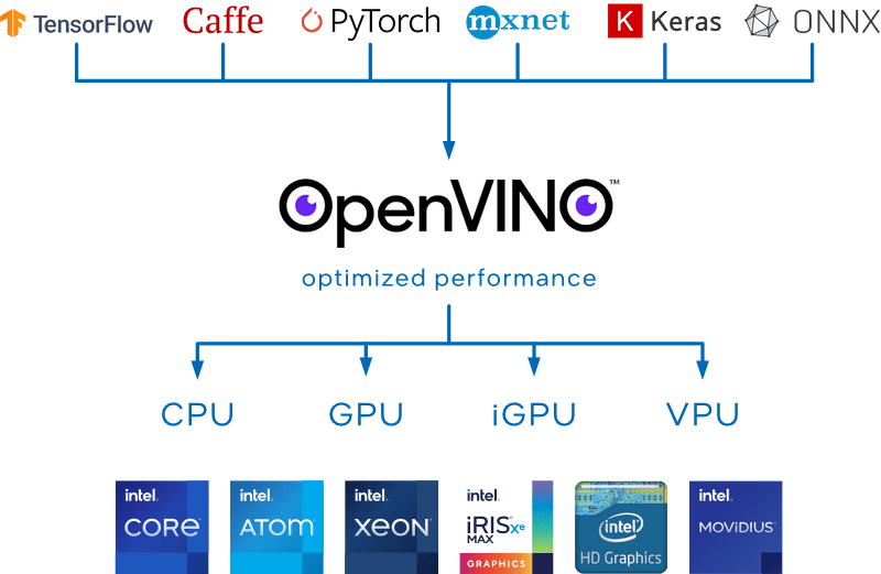 今井「あまり知られていませんが、インテルのCPUにはAIを高速化する命令機能(インテル® DL ブースト、VNNIなど)やインテグレートされているGPU機能があります。さらにCPUを中心としたさまざまなインテルのハードウェア性能を最大限に発揮するためのオープンソースの開発ツールキットを提供しています。中でも代表的なツールキットが、AI推論に特化したOpenVINO™ ツールキットです」