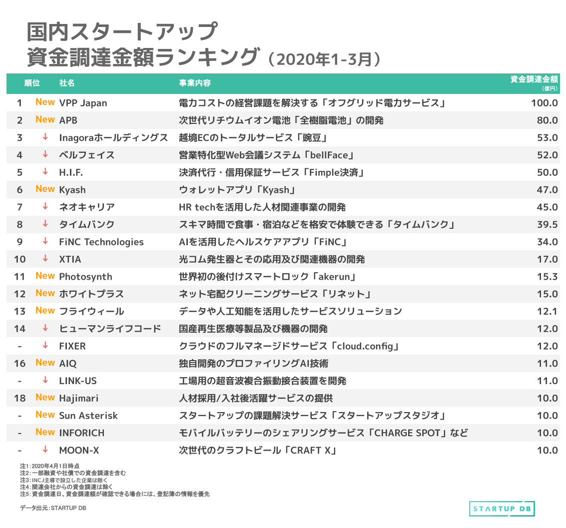電力コストの経営課題を解決する次世代サービス「オフグリッド電力サービス」を提供するVPP Japanが総額100億円の資金調達に成功し、2020年3月時点の資金調達金額ランキングでは首位となった。VPP Japanはみずほ銀行をエージェントとしたシンジケートローンによる総額100億円の資金を調達。同時に、アイ・グリッド・ソリューションズ、伊藤忠商事を引受先とした第三者割当増資による資本業務提携を実施(出資額および出資比率は非公表)。2021年までに国内の流通サービス500施設、累計100MWの自家消費太陽光発電システム導入を推進する。また、今後国内最大の自家消費太陽光発電システム運営事業者を目指し、国内のクリーンエネルギー転換における中心的な役割を担っていく方針だという。続いて、次世代リチウムイオン電池「全樹脂電池」の開発を進めるAPBも総額80億円の大型資金調達を実施。今回の資金調達は、同社が開発する全樹脂電池の量産工場設立を主たる目的とするものであり、全樹脂電池の量産技術の確立、製造販売の開始に向けて投資を推進していく見込みとなる。ウォレットアプリ「Kyash」や決済プラットフォーム「Kyash Direct」を展開するKyashは、シリーズCラウンドでジャフコと8つの海外投資家を引受先とする総額47億円の資金調達を実施した。今回の資金調達を受けて、事業領域の拡大、特にデジタルバンク事業の推進に充当していく方針だという。代表の鷹取氏が、創業当初より構想しているデジタルバンクの実現に向け、関連する特許の取得なども含めて金融インフラの構築を目指す。2020年4月以降もどのスタートアップが資金調達をして成長していくのか注目していきたい。