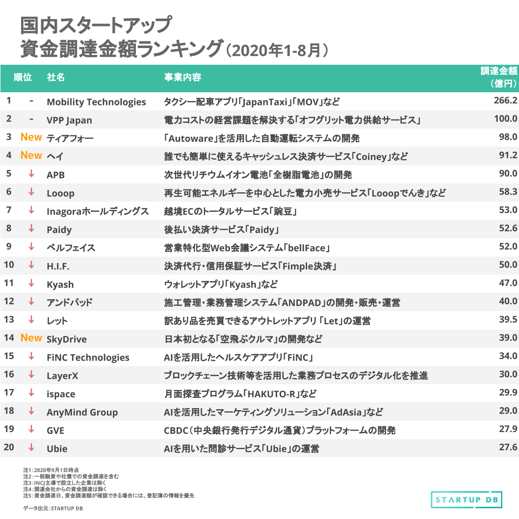 国内スタートアップ資金調達ランキング(2020年1-8月)では、ティアフォーが総額98億円の資金調達を実施し、2020年の累計資金調達額では3位にランクイン。また、ヘイは70億円以上の資金調達を実施し、ティアフォーに続いて4位に新規ランクインとなった。そのほか、「空飛ぶクルマ」を開発するSkyDriveが39億円の資金調達を実施し、14位となった。自動運転システム用オープンソフトウェア「Autoware」を運営するティアフォーは、SOMPOホールディングスによる第三者割当増資の引受と、株式取得により98億円の資金調達を実施。これにより、ティアフォーは、SOMPOホールディングスの関連会社となった。今後は、自動運転技術の社会実装に向けて、両社で開発を進めていく見込みだ。▼ティアフォー代表、加藤真平氏のインタビュー記事