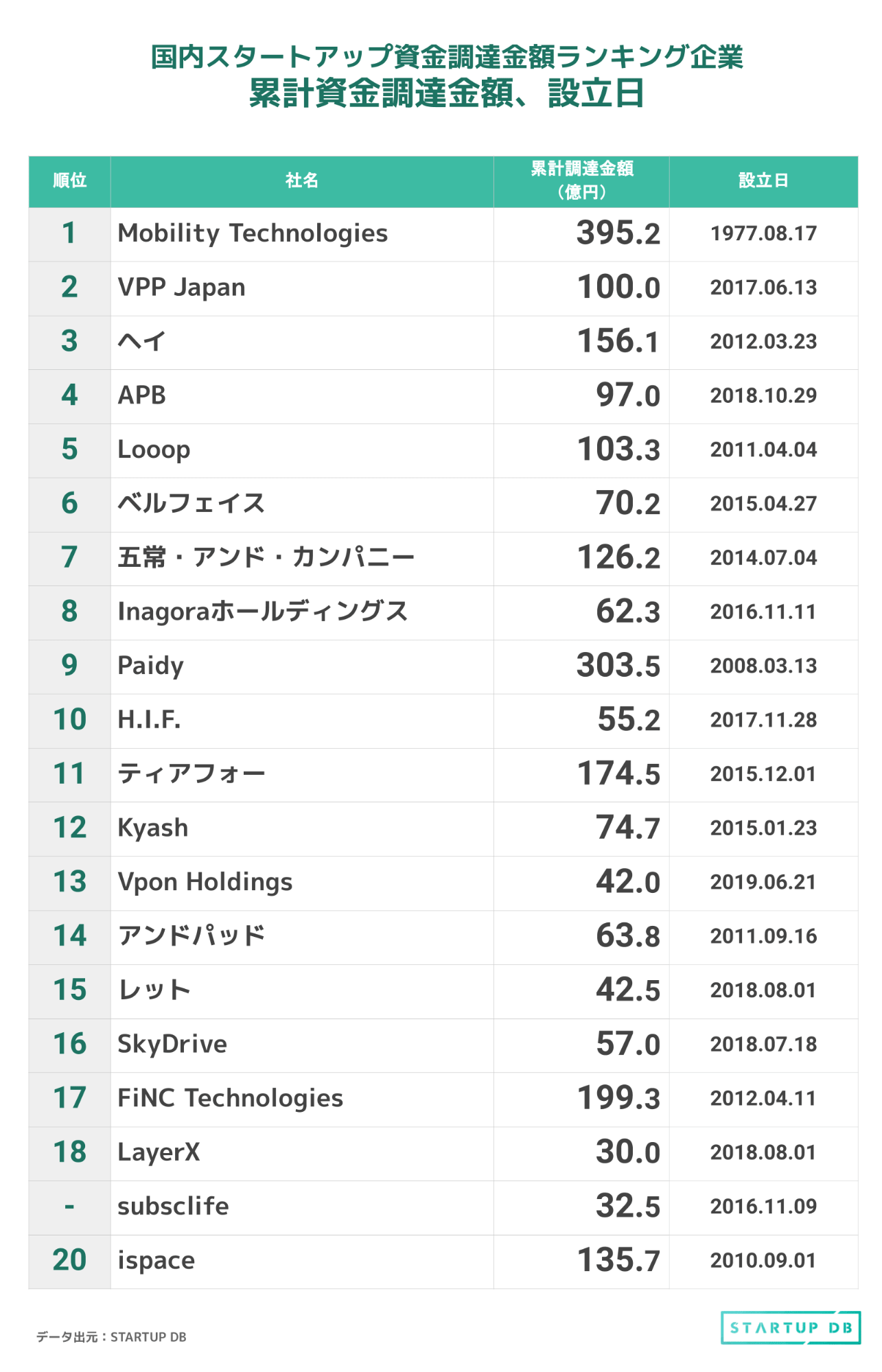 今回ランクインした企業のうち、Mobility Technologies、VPP Japan、ヘイ、Looop、五常・アンド・カンパニー、Paidy、ティアフォー、FiNC Technologies、ispaceの9社が累計調達金額100億円を突破している。ランクイン企業20社のうち、設立5年以内の企業は全体の半数の10社となっている。Vpon Holdingsは、設立から約1年でランクインし、設立約2年でランクインとなったABP、レット、LayerXと続く。STARTUP DBでは次月以降も引き続き、資金調達ランキングと主要トピックに関する記事をリリースしていく。