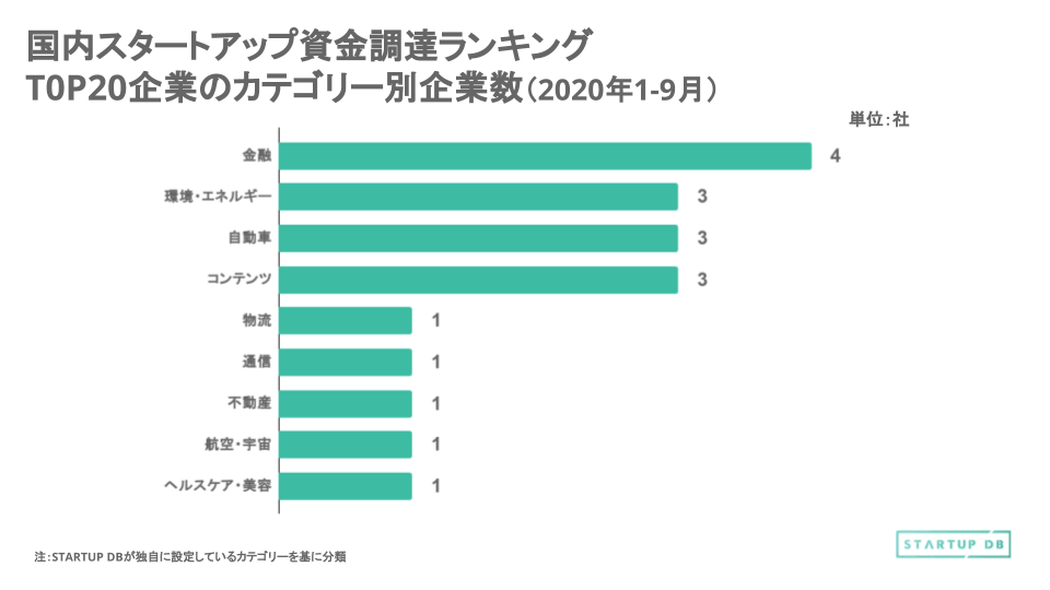 カテゴリー別では、金融が4社と最も多く、環境・エネルギー、自動車、コンテンツがそれぞれ3社となった。金融領域では、前述した五常・アンド・カンパニー、後払い決済サービス「Paidy」を運営するPaidy、決済代行・信用保証サービス「Fimple決済」を提供するH.I.F.、ウォレットアプリ「Kyash」などを提供するKyashが名を連ねた。この4社はいずれも今年に入って45億円以上の資金を集めている。突出して社数の多いカテゴリーがないことから、様々な分野の企業が大型調達していることがわかる。