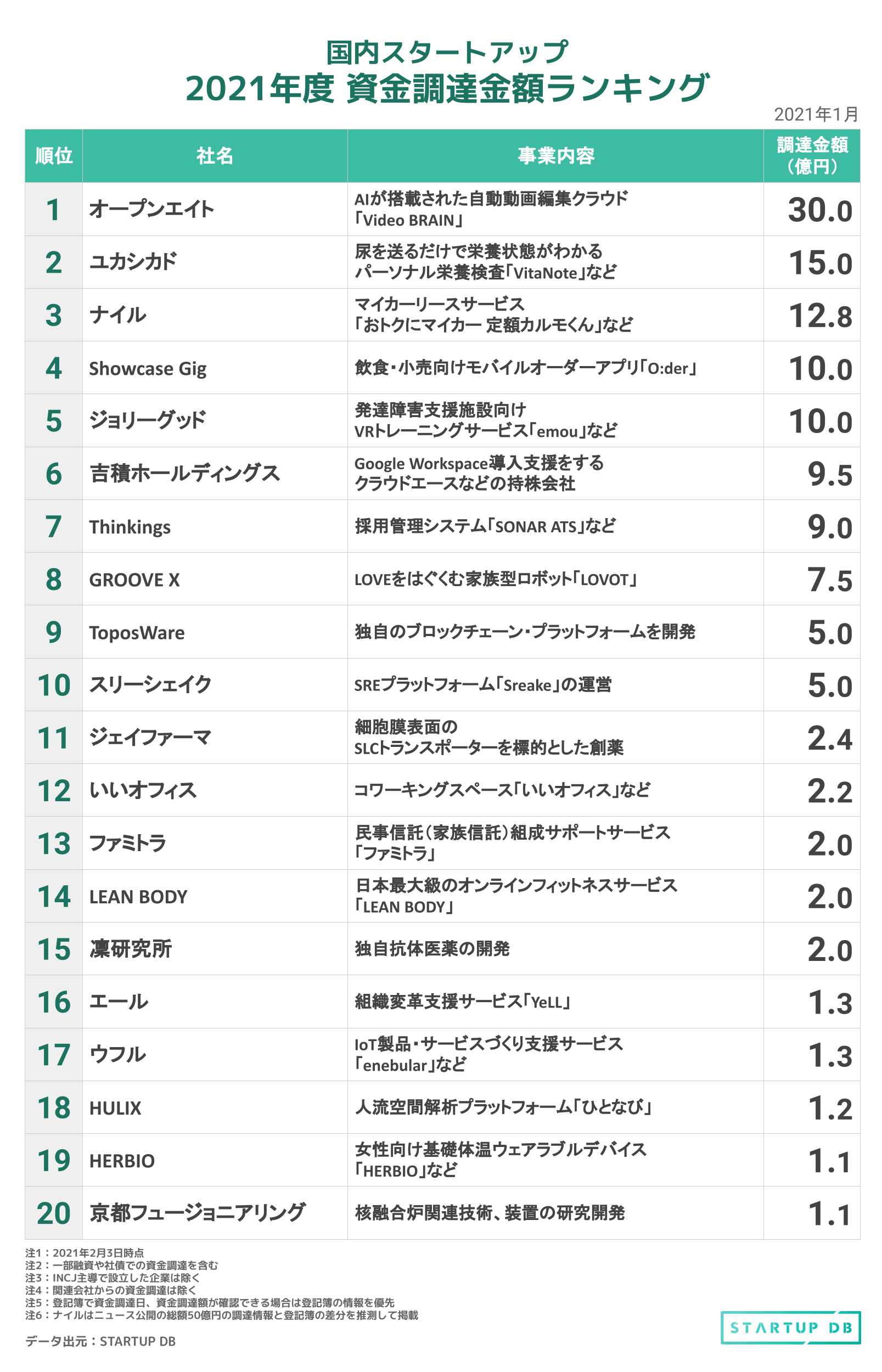 調達金額上位5社の平均額は、国内スタートアップ資金調達金額ランキング(2020年1月)では37.7億円であったのに対し、2021年1月の平均は15.5億円となっている。大型の資金調達は例年に比べ少ない。インハウスAI動画編集クラウド「VIDEO BRAIN」やSNS投稿・分析サービス「Insight BRAIN」を提供するオープンエイトが、JPインベストメント、スパークス・グループ、日本政策金融公庫から総額30億円の資金調達を実施し、2021年1月の資金調達ランキングではTOPとなった。パーソナル栄養検査サービス「VitaNote」などを提供するユカシカドは、前澤ファンド、日本政策金融公庫などから総額15億円の資金調達を実施した。調達した資金は、財務基盤の強化と大規模プロモーション実施による栄養改善市場の拡大に充当する見込みだ。マイカーリースサービスを提供するナイルは、DIMENSION、JICベンチャー・グロース・インベストメンツ、環境エネルギー投資、博報堂DYメディアパートナーズ、SBIグループ、日本ベンチャーキャピタル、グリーベンチャーズ、デジタル・アドバタイジング・コンソーシアム、その他個人投資家を引受先として、約37億円の第三者割当増資を実施、さらに複数金融機関から約13億円の融資を受け、総額50億円超の資金調達を実施した。今回は登記簿を元に、2021年1月以降に調達した金額を推測し、12億8,000万円の資金調達として扱っている。今後は、自動車整備工場や自動車ディーラー、サービスステーションなどの自動車関連事業社とのアライアンスを強化拡充し、各事業との親和性が高い企業のM&Aも積極的に検討していくとする方針を示している。次世代エネルギー源として注目をされている核融合技術の開発に取り組む企業に工学的ソリューションを提供する、京都大学発のスタートアップ、京都フュージョニアリングは、Coral Capitalを引受先として1億1,600万円の資金調達を実施した。