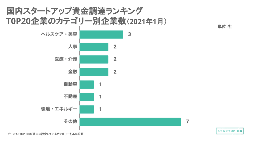 カテゴリー別では、ヘルスケア・美容分野が3社と最も多く、人事、医療・介護、金融分野が2社と続いた。ヘルスケア・美容分野では、ユカシカド、LEAN BODY、HERBIOの3社。医療・介護分野では、ジェイファーマ、凜研究所が資金調達を実施している。LEAN BODYは、オンラインフィットネス動画配信サービス「LEAN BODY」を運営するスタートアップ。自宅で過ごす時間が多い昨今の情勢も追い風となり、2020年の利用者数は昨対比約900%の伸びを見せている。厚生労働省によると、2025年、日本の65歳以上の高齢者の割合は30.3%になると予想されている。出生数は2019年に戦後初めて90万人を割り、86万5,239人となった。また、経済産業省の資料では、2016年度に約25兆円であったヘルスケアの国内市場規模は、2025年には約33兆円にまで増大すると推計されている。少子高齢化が進む課題先進国である日本において、健康寿命を伸ばすことが喫緊の課題となっており、ヘルスケア分野に注目が集まっている。STARTUP DBでは次月以降も引き続き、資金調達ランキングと主要トピックに関する記事リリースしていく。