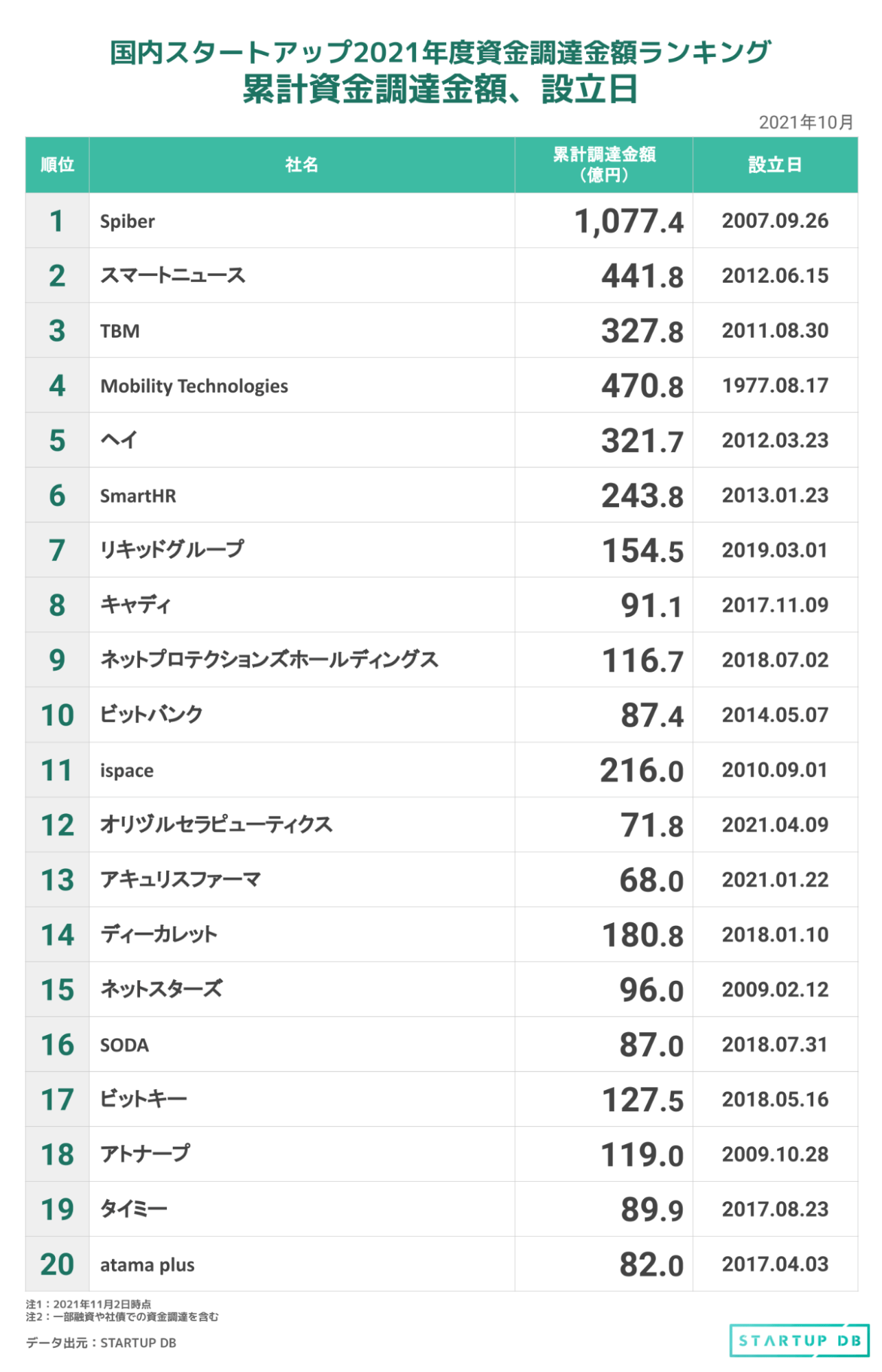2021年1-10月の国内スタートアップ資金調達金額ランキングでは、アキュリスファーマとビットキーが新たにランクインを果たした。また、オリヅルセラピューティクスは登記簿から11億8,400万の新規調達を確認し、順位を3つ上げ、13位に浮上した。
