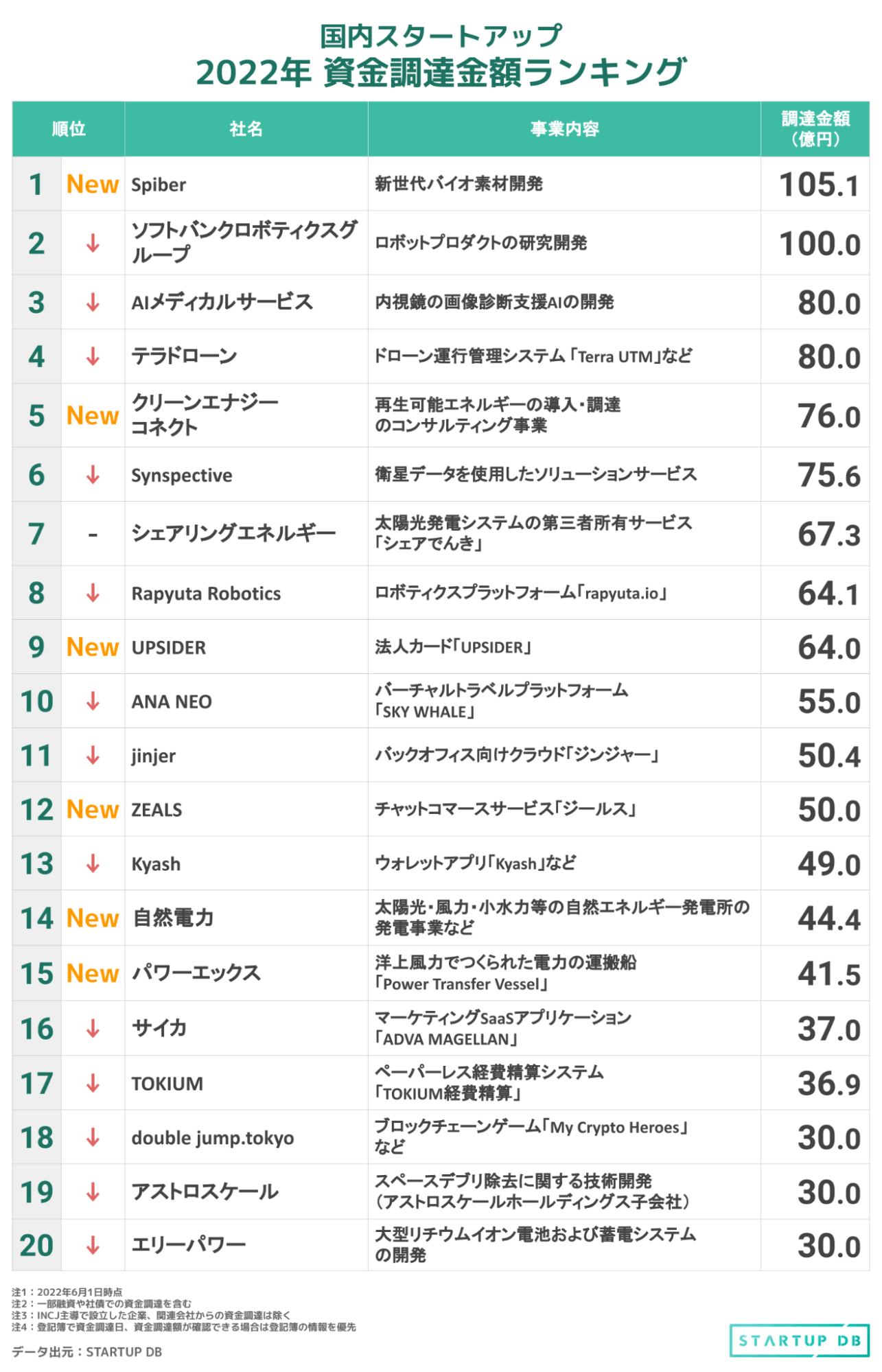 2022年1- 5月の国内スタートアップ資金調達金額ランキングにおいて、新規ランクイン企業は、1位にランクインしたSpiberをはじめ、クリーンエナジーコネクト、UPSIDER、ZEALS、自然電力、パワーエックスの計6社であった。1位にランクインした構造タンパク質素材「Brewed Protein」を開発するSpiberは、2022年3月に105億1,049万円の資金調達を行っていることが登記簿より確認できた。今まで調達した金額は1,205億5,400万円にのぼり、これらの資金によって米国での生産活動を広げていくことが予定されている。また、新たにエネルギー関連のスタートアップのクリーンエナジーコネクト、自然電力、パワーエックスの3社がランクインした。それぞれ電力に関連した事業を展開しているが、ビジネスモデルは異なっている。クリーンエナジーコネクトは、再生可能エネルギーの導入・ 調達コンサルティングなどの法人向けグリーン電力・ソリューション事業を手がけている。再生エネルギーのプロフェッショナルとして、顧客が抱える再生可能エネルギーのさまざまな課題解決に向き合い、導入法やコストを抑えた運用法など、最適なソリューションのアドバイスやアレンジを行う。同社は、2022年5月にみずほ銀行をエージェントとした金融機関7社のシンジケートローンにより、総額76億円の資金調達を実施した。自然電力は太陽光発電、風力発電、小水力発電などの自然電力設備の設計を手掛けるスタートアップだ。家庭単位の電力の自給自足をサポートするために、太陽光電池や蓄電池の導入も意欲的に進めている。パワーエックスは、海域にある洋上風力発電所から海岸にクリーンエネルギーを輸送する電気運搬船「Power Transfer Vessel」を運営するスタートアップ。洋上風力発電は、風の強い沖合や離島といった発電効率性の高い場所での発電が可能だ。同社は2022年5月に、シリーズAラウンドにて、Spiral Capital、日本瓦斯をリードインベスターとした複数社から41億5,000万円の資金調達を実施した。そのほか、成長・上場を支える法人カード「UPSIDER」の運営を行うUPSIDERが新規ランクイン。同社は2022年5月に、シリーズCラウンドにて総額150億円の資金調達を実施した。引受先は、リード投資家のDST Global PartnersとWiLをはじめ、Arena Holdings、Tybourne Capital Management、三菱UFJキャピタル、セゾン・ベンチャーズだ。同社の提供する法人カードは、利用限度額を従来のカードよりも引き上げており、利用限度額が原因で事業成長がストップしてしまうという課題を解決する。また、リアルタイムに決済データをネット上で確認できるため、安心して利用することができる。