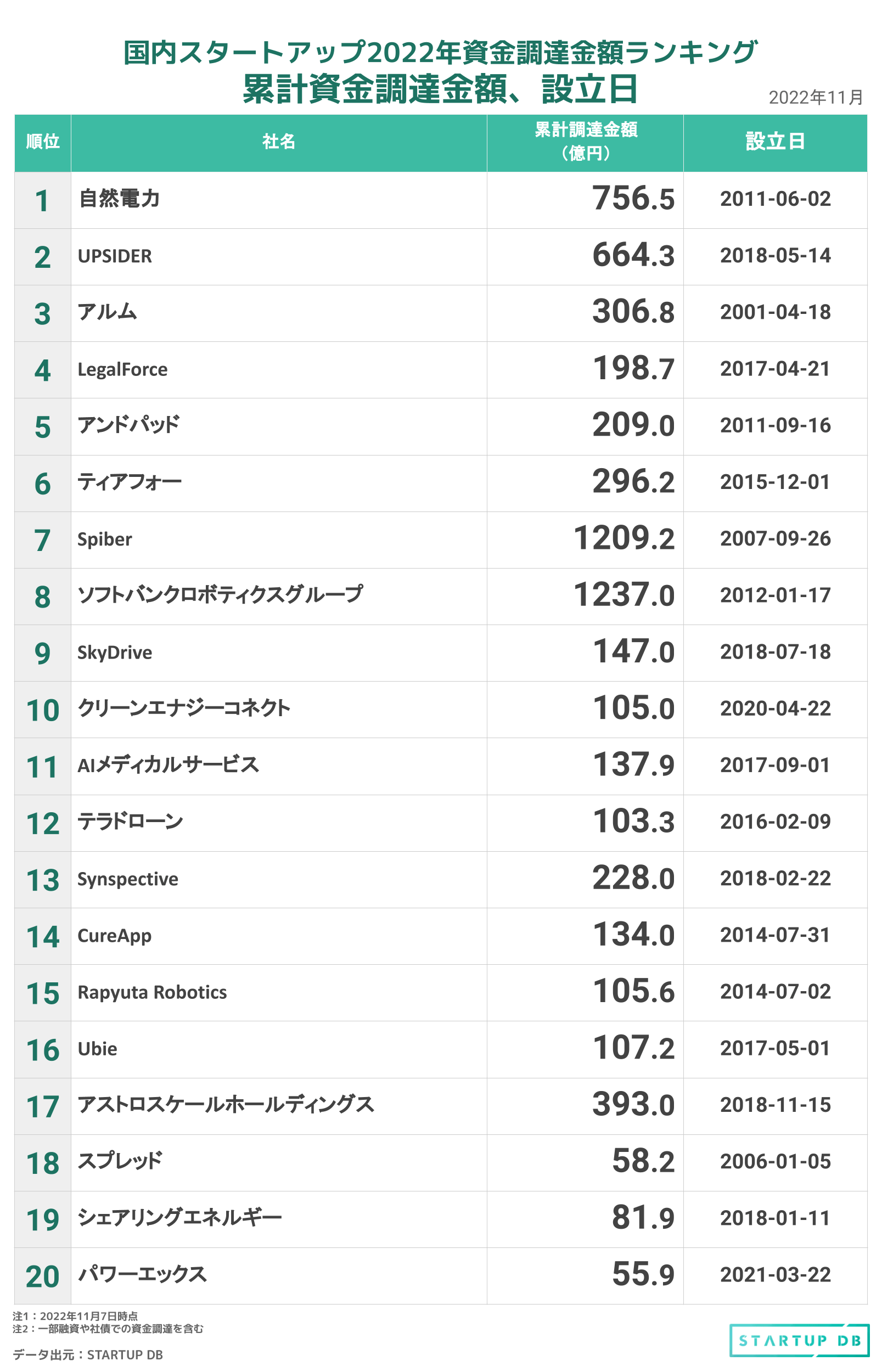 トップ20にランクインしている企業のうち、上位17社が累計資金調達金額100億円を超えている。また、2022年11月7日時点で、2022年10月における資金調達金額の中央値は9,987万円、平均値は15億4,988万円、資金調達合計金額は1,394億9,006万円となった。(一部融資や社債での資金調達を含む)その背景としては、自然電力の700億円、UPSIDERの467億円などの超大型資金調達が平均を引き上げており、先月比較でも、今月の平均値と合計金額が特に高額であることが読み取れる。
