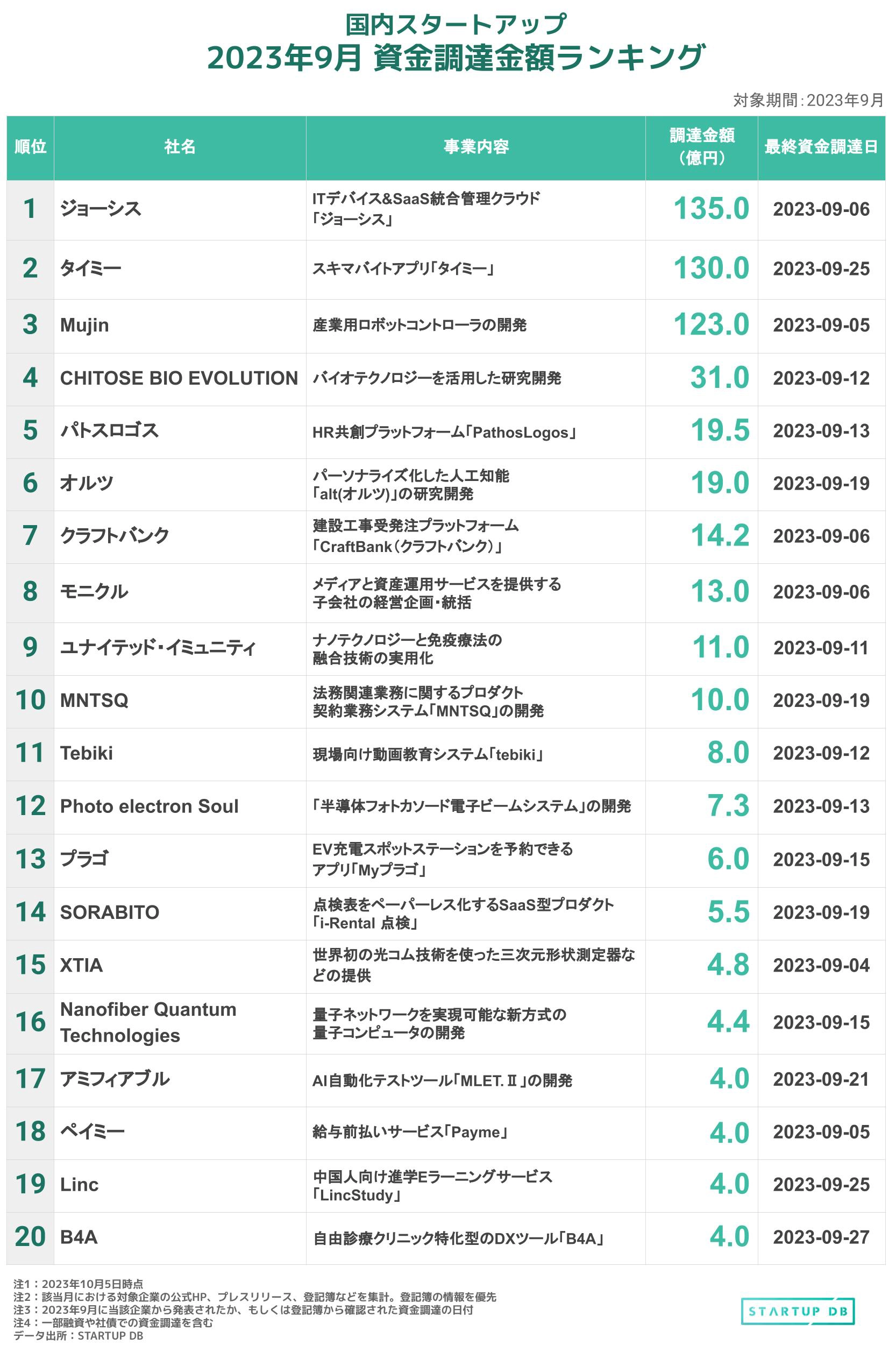 2023年9月に発表された資金調達を金額ベースでランキング形式にまとめた。