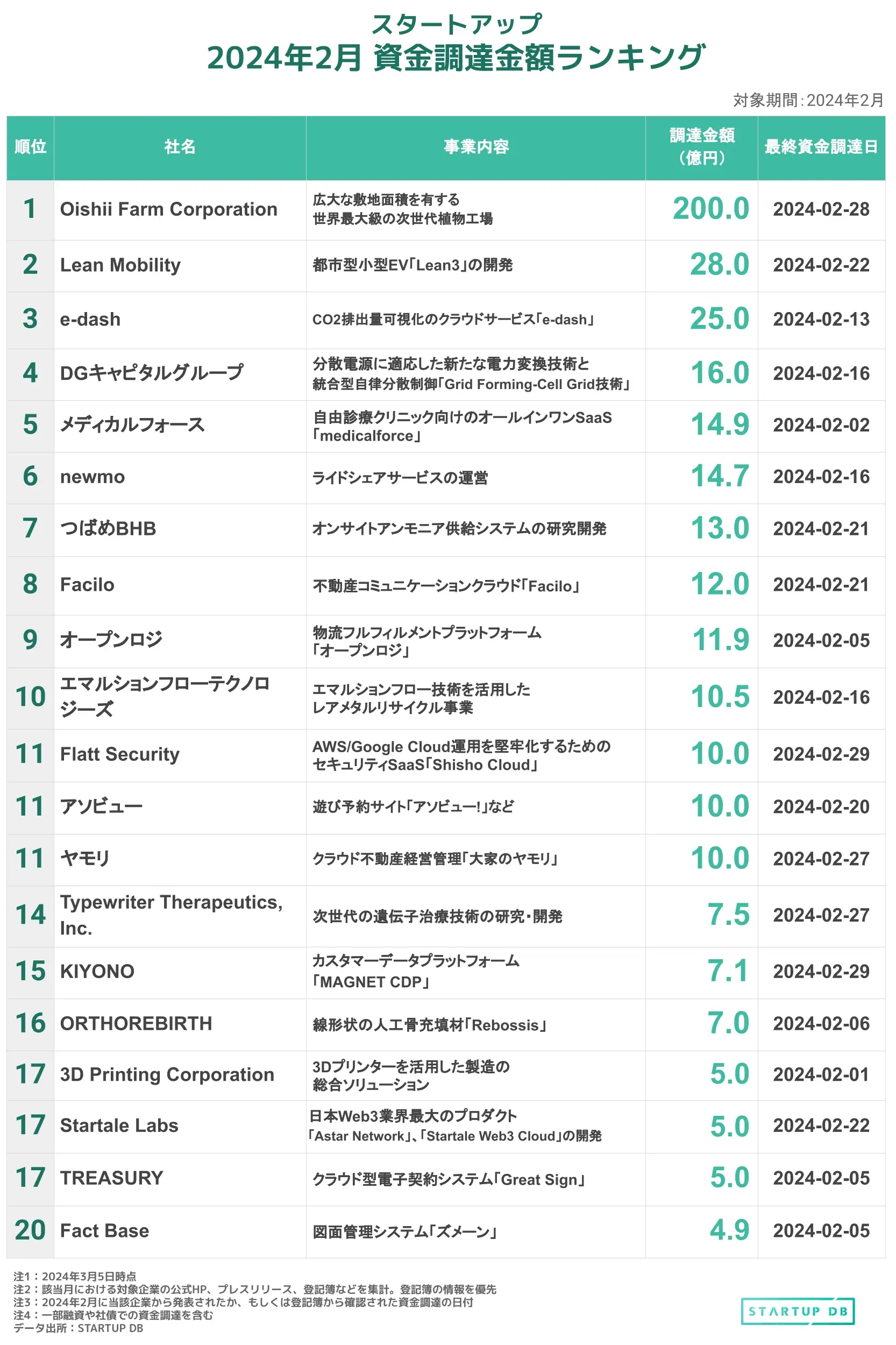 2024年2月に発表された資金調達を金額ベースでランキング形式にまとめた。