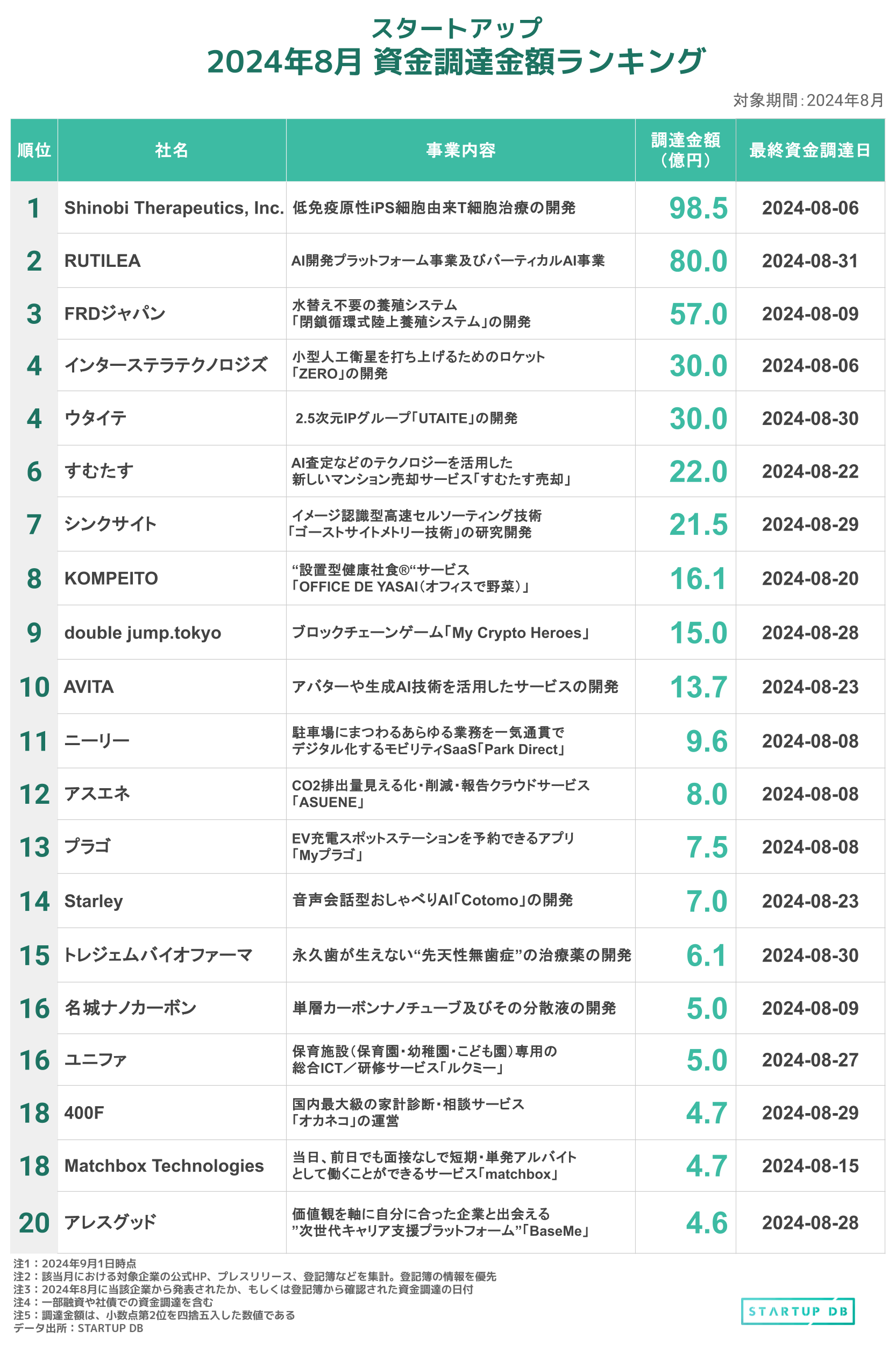 2024年8月に発表された資金調達を金額ベースでランキング形式にまとめた。