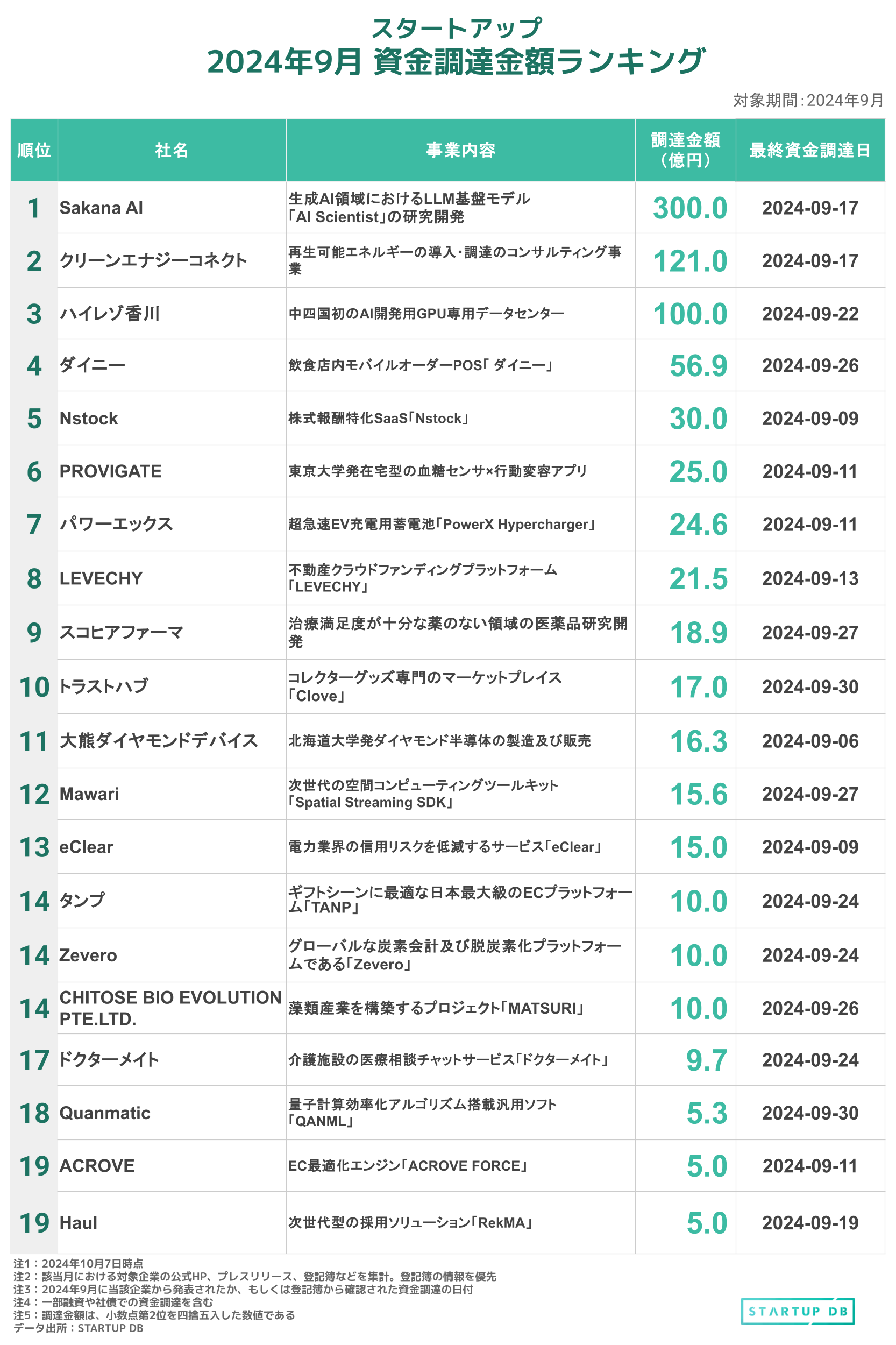 2024年9月に発表された資金調達を金額ベースでランキング形式にまとめた。