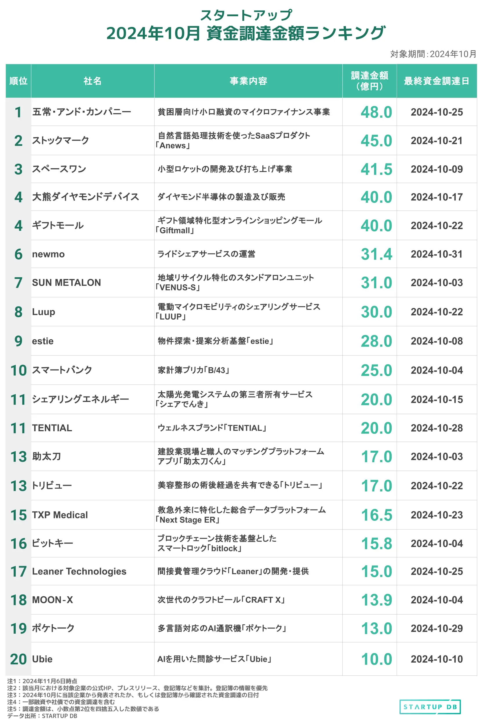 2024年10月に発表された資金調達を金額ベースでランキング形式にまとめた。