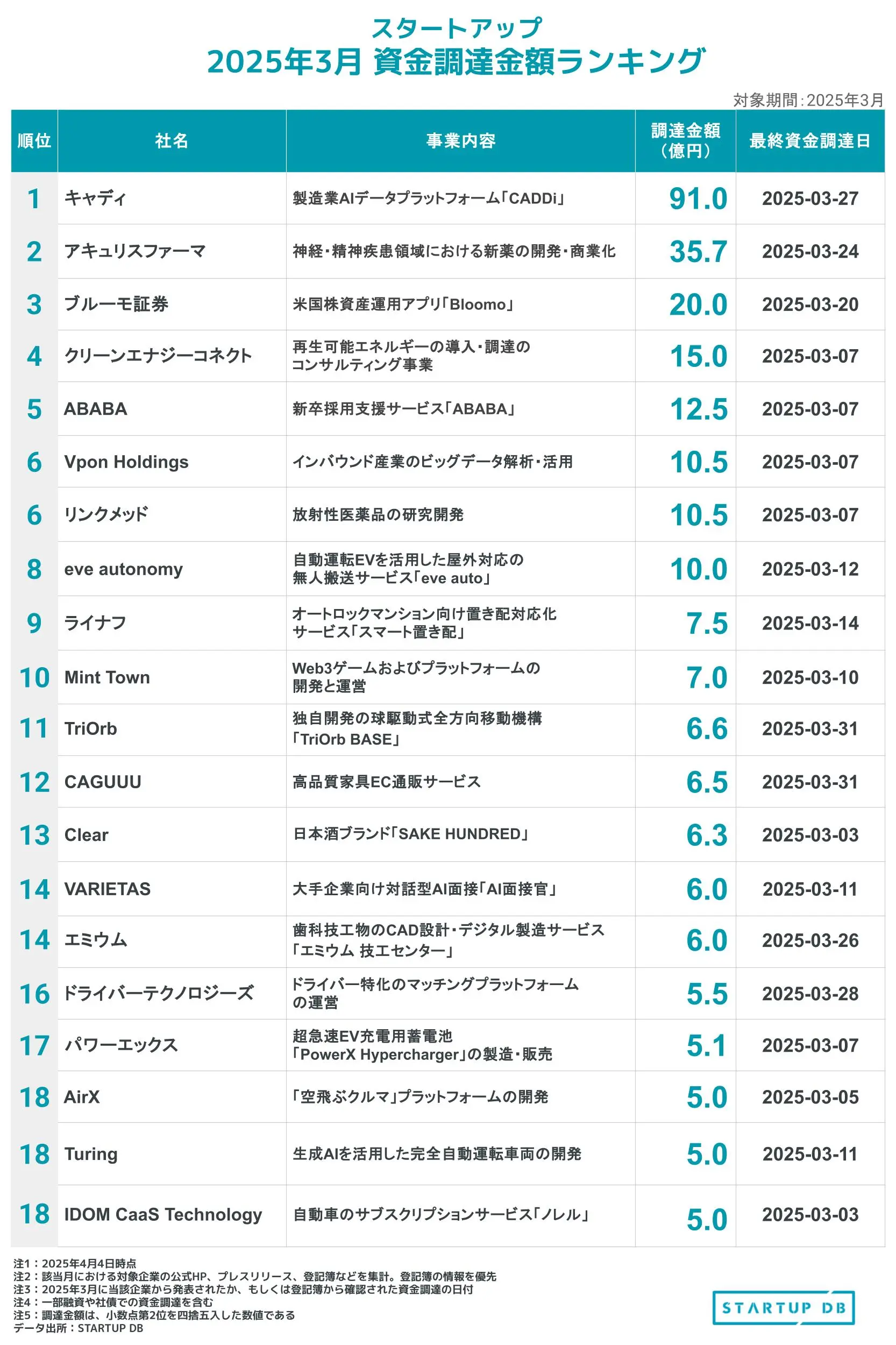 2025年3月の資金調達額の合計をランキング形式で並べた。原則的に登記簿から取得した調達日を優先しており、次点でプレスリリースなどの公式発表も集計している。