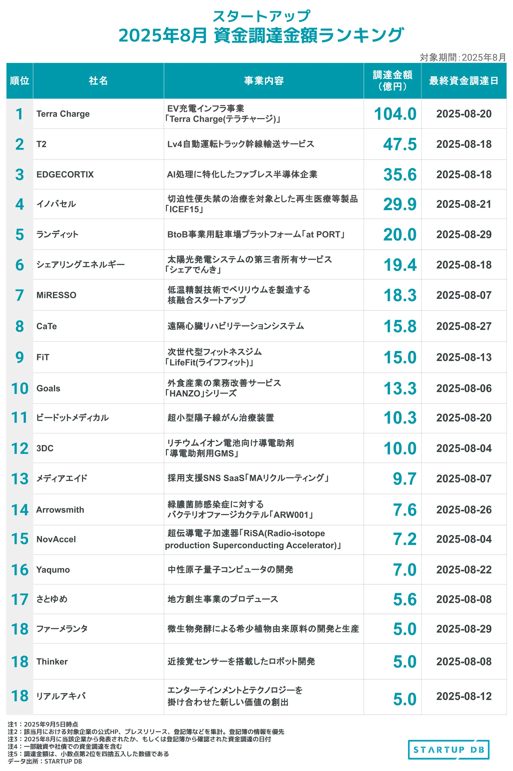 2025年8月の資金調達額の合計をランキング形式で並べた。原則的に登記簿から取得した調達日を優先しており、次点でプレスリリースなどの公式発表も集計している。