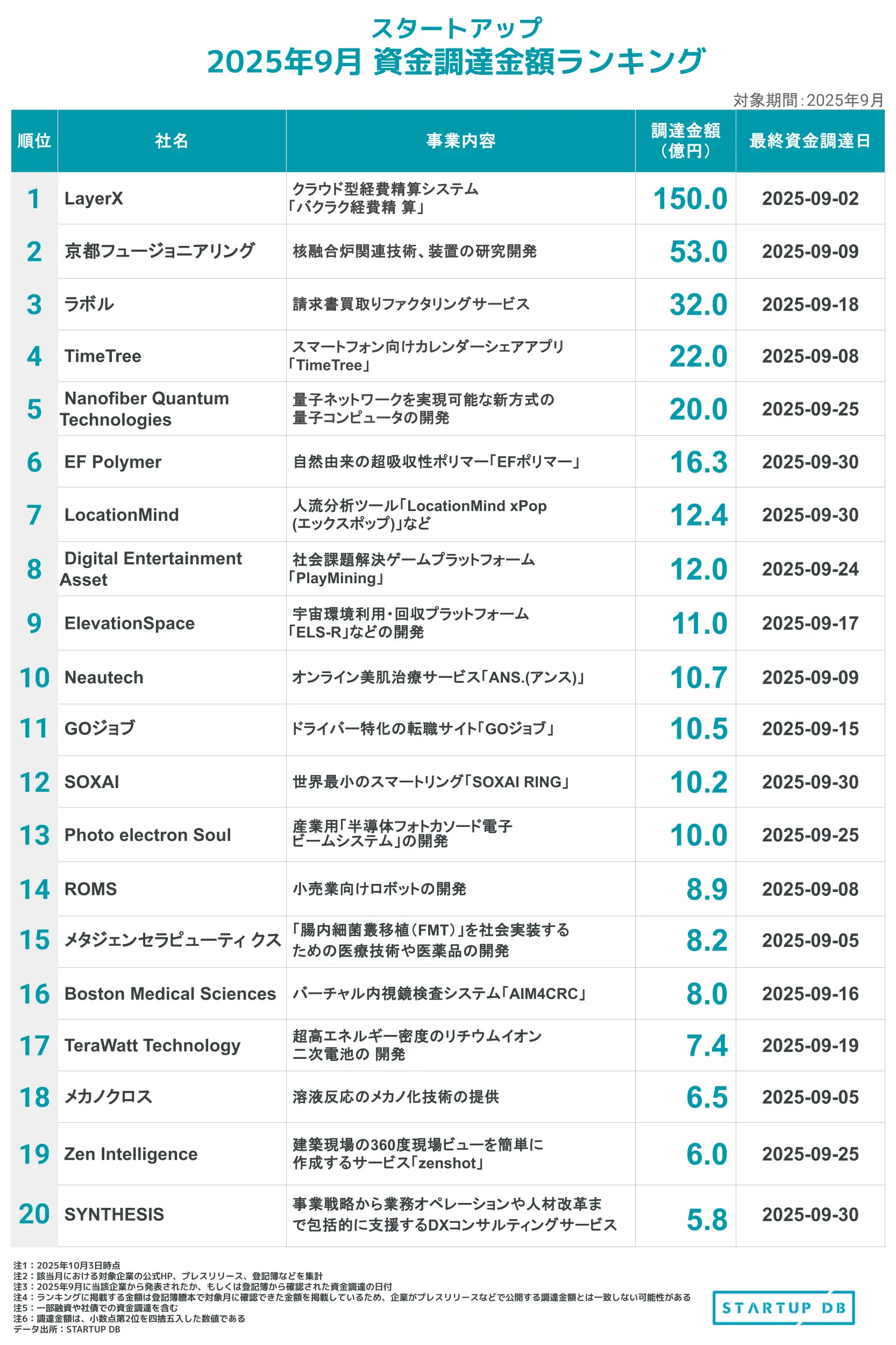 2025年9月の資金調達額の合計をランキング形式で並べた。原則的に登記簿から取得した調達日を優先しており、次点でプレスリリースなどの公式発表も集計している。