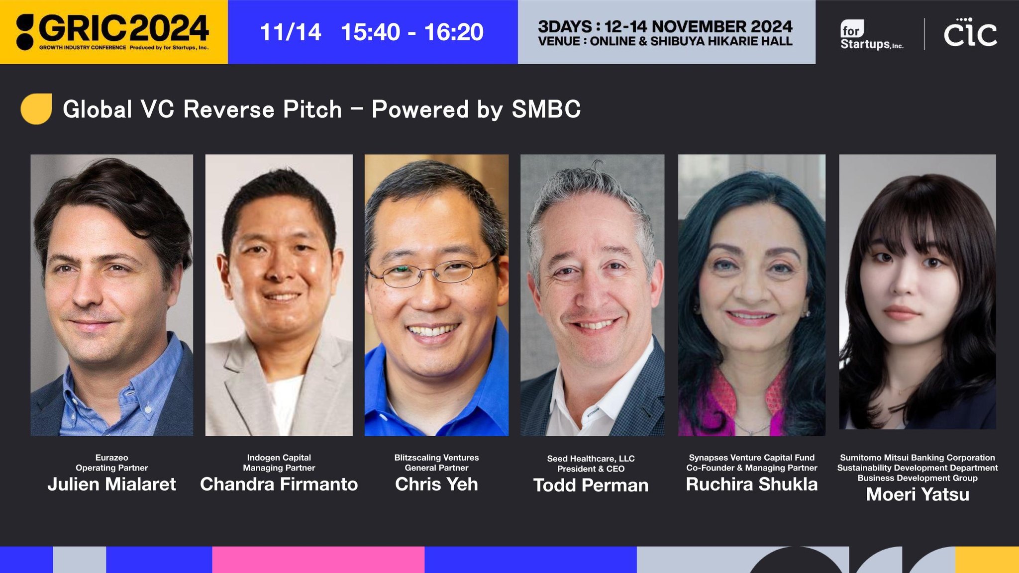 11月14日に渋谷ヒカリエで開催された国内外のスタートアップとエコシステムビルダーが交わる場である「GRIC2024」で、SMBCグループは、日本のスタートアップとグローバル投資家をつなぐ架け橋として、リバースピッチセッションを企画。世界の5つの有力VCが登壇し、それぞれの投資戦略や支援体制をアピールした。