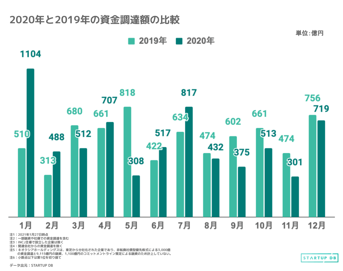 STARTUP DBが集計したデータより、2020年と2019年のスタートアップ全体の資金調達動向を紐解いていく。まずは月別資金調達額を比較していく。