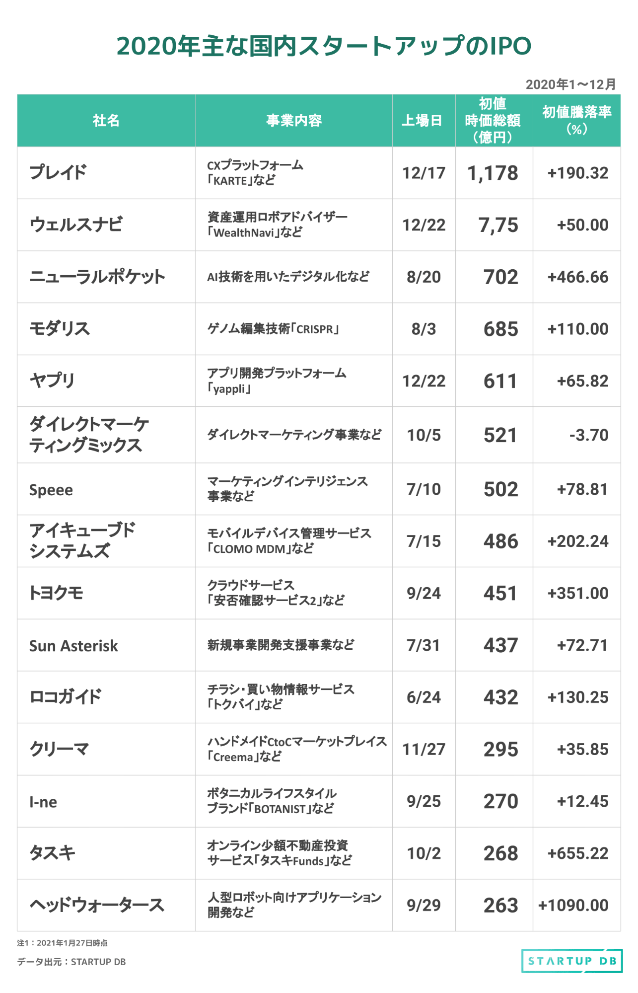 2020年には新型コロナウィルス感染症の影響もあり、2020年3〜4月に上場を予定していた18社が上場を一時取りやめたが、うち10社は2020年に上場を果たし、全市場を合計した上場企業数は93社であった。なお、2019年のIPO実施企業数の合計は86社であった。2020年に新規上場を果たしたスタートアップで、初値時価総額が上位の企業を一覧にしてまとめた。