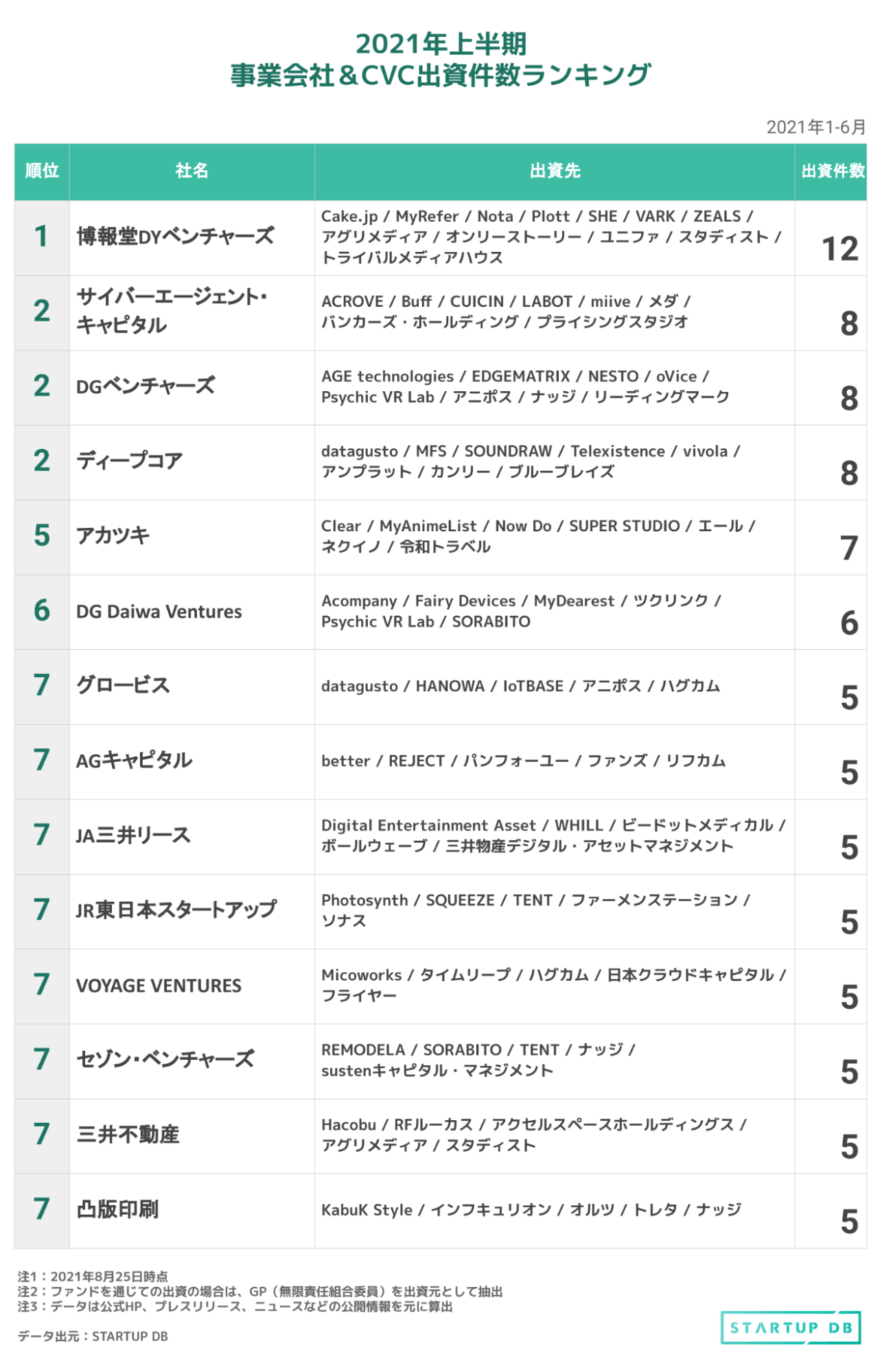 2021年上半期に確認された、スタートアップへの出資を行なっているCVCと事業会社をランキング形式にしてピックアップした。