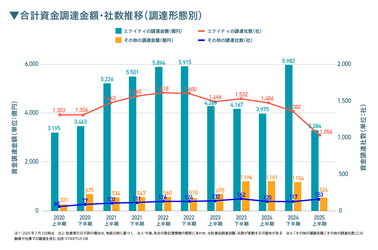 「その他」の調達金額は前年より落ち込んだものの、調達社数は増加しており、エクイティ以外の手段を選択するスタートアップが増加している。24年には数百億円規模の大型デットファイナンスが複数公表されたが、25年上半期は大型融資が少なかったことで金額は抑えられた。一方で、デットファイナンスや補助金などを活用する企業は着実に増えており、スタートアップの調達手段が多様化している実態がうかがえる。