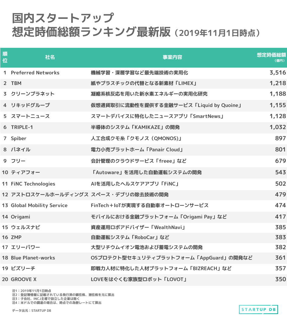 最も変動が大きかったのは紙やプラスチックの代替となる新素材「LIMEX」を手がけるTBM。前回想定時価総額の2倍となる1200億円越えとなりユニコーン企業となった。飛躍したTBMは、サウジ基礎産業公社とSABIC社が実施する「NUSANED」プログラムへ参加する基本合意を締結した。SABIC社とともにサウジアラビア国内でのLIMEX製品の製造・販売に向けた方針を進めると同時に、サウジアラビア関係機関・企業と協力の可能性について向き合っていく。新規で、ロボアドバイザーによる全自動での資産運用を可能にするウェルスナビもランクインした。2019年11月6日の日本経済新聞によると、ウェルスナビは第三者割当増資で約41億円を調達(2019年11月1日時点における登記簿情報では約26億円の登記)。調達した資金は、人工知能(AI)を活用した新サービスの開発に充てるという。さらに実際の顧客の投資行動などのデータを分析し、個々の資産状況やライフプランに応じた運用アドバイスをAIが自動で通知するシステムの開発にもつなげていく。