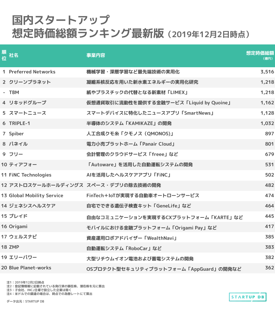 2019年11月27日にプレイドは、Googleからの出資を受けたことを発表した。Googleが日本企業に出資するのは、2018年12月のABEJAに続いて2社目だ。Googleがプレイドに出資した金額は、プレスリリース上で非公表だが、登記簿情報から推計するとおおよそ19億円だ。この調達によりプレイドの想定時価総額は約445億円となり、15位に新規ランクインした。Googleとプレイドはこの調達を期に、「KARTE」へのGoogle Cloudの機械学習やAI技術の統合において、協業していく予定だという。これにより、今まで以上に高機能で拡張性の高い、安全なクラウドプラットフォームを企業に提供することが可能となり、エンドユーザーに対してのパーソナライズとCX(顧客体験)の向上を実現していく。また、前回3位だったクリーンプラネットが2位に上昇した。その他ランキングに大きな変動はなかったものの、Spiberやパネイルはユニコーンに近い想定時価総額を誇っているので今後の変動に期待したい。2019年11月には、ランサーズやフリー、スペースマーケットなどの上場承認ラッシュが起こっている。想定時価総額ランキング上位に位置しているスタートアップのIPOにも注目していきたいところだ。