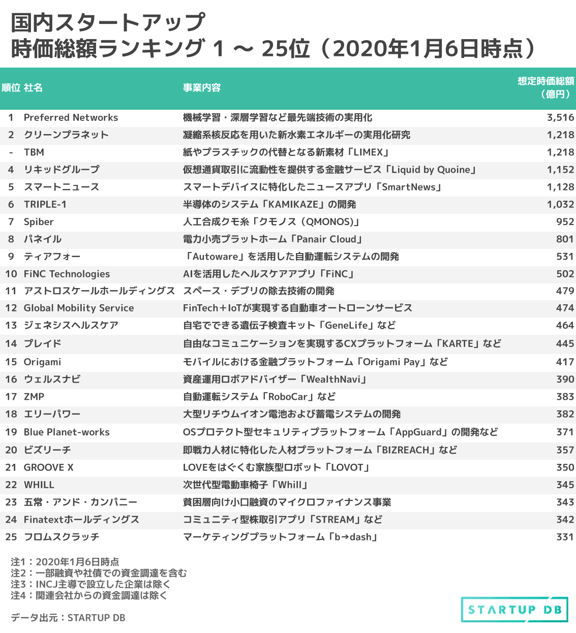 2019年は国内ユニコーン企業数が6社に増えた。2018年時点では現在1位であるPreferred Networksと2018年に上場したメルカリの2社しかなかったことを考えると、日本のスタートアップの成長が著しいことがわかる。しかし、CB Insightsの調査によると、米国発のユニコーン企業は累計で150社を超えており、グローバルリーダーには程遠いのが現状だ。今回は国内スタートアップの想定時価総額を1位から50位までまとめた。ランキングに入っている各スタートアップの領域をみてみると、ディープテックが15社、SaaSが11社、フィンテックが9社であった。ディープテック領域の内、Preferred Networks、クリーンプラネット、TBM、TRIPLE-1の4社がユニコーンとなっており、国内ユニコーン企業数の2/3を占めている。SaaS領域ではKARTE運営のプレイド、HRMOSの運営の他、転職サイトBizReachの運営も行なっているビズリーチ、b-dash運営のフロムスクラッチ、SmartHRなどがランキング入りを果たしている。プレイドはGoogleからの調達を、フロムスクラッチはKKRやゴールドマン・サックスなどから約100億円の調達を、SmartHRは UberやSlack、Lyftなどに投資を行なっているLight Street Capitalなどから61億5000万円の調達を実施しており、海外投資家からも注目されている。フィンテック領域ではリキッドグループがユニコーンに、そのほかにもOrigami、ウェルスナビなどが見受けられた。STARTUP DBでは今後も想定時価総額のランキングレポートを出していく。その中でさらなるユニコーン企業が生まれ、世界へ羽ばたき、成長していく姿をこれからも注目していただきたい。