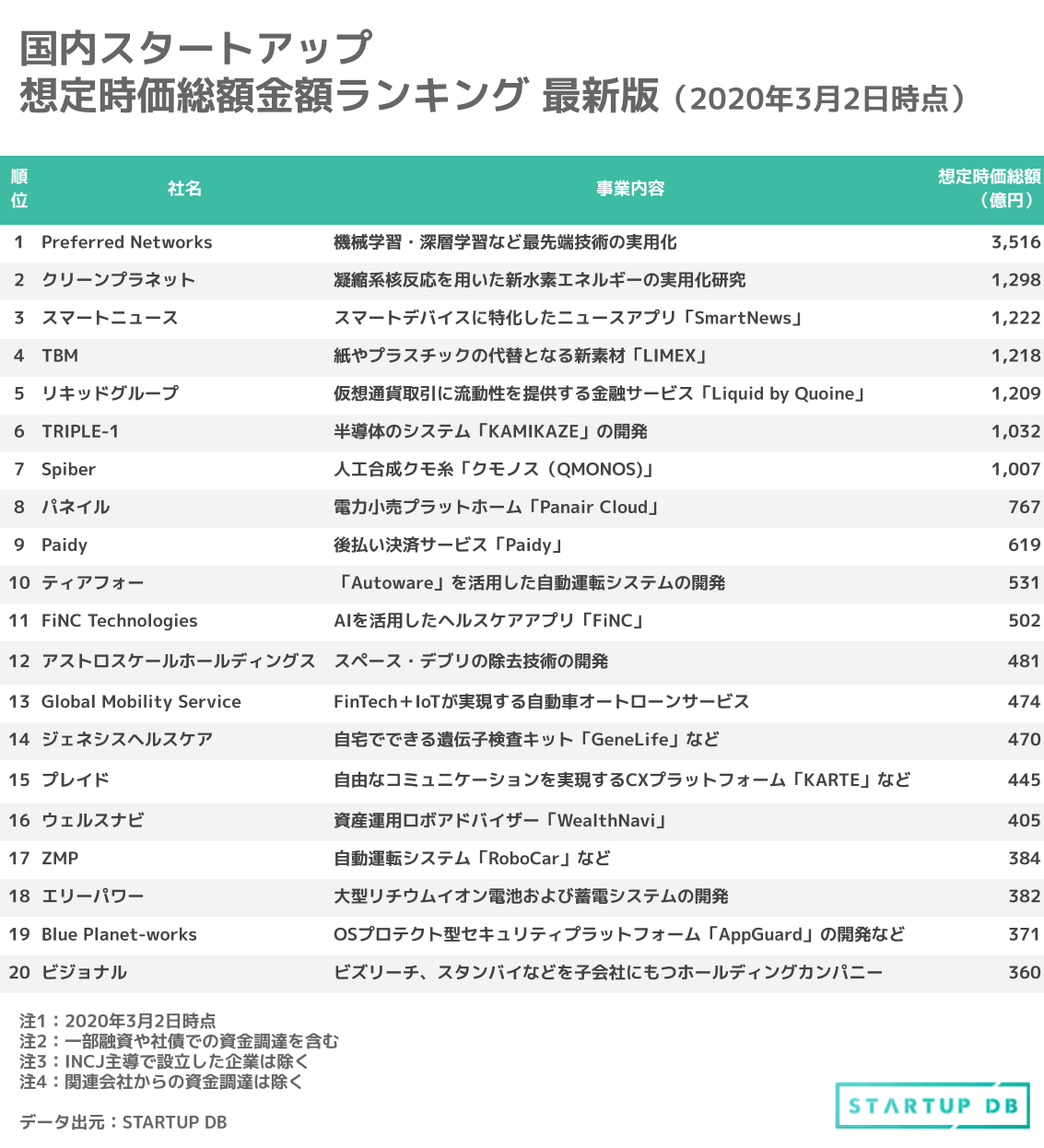 これまでビズリーチがランキングに入っていたが、今月からビジョナルがランクインした。ビズリーチはグループ経営を支えるホールディングカンパニーとしてビジョナルを新設し、ビズリーチはビジョナルの完全子会社となった。同時に、新設分割を用いて、ビズリーチ内の新規事業開発を担う組織であるインキュベーションカンパニーをビジョナル・インキュベーションとして分社化し、ビジョナルの完全子会社とした。その他、今回のランキングはTOP20位の変動がなかったが、次月以降も引き続きスタートアップの想定時価総額の変動を追っていきたい。