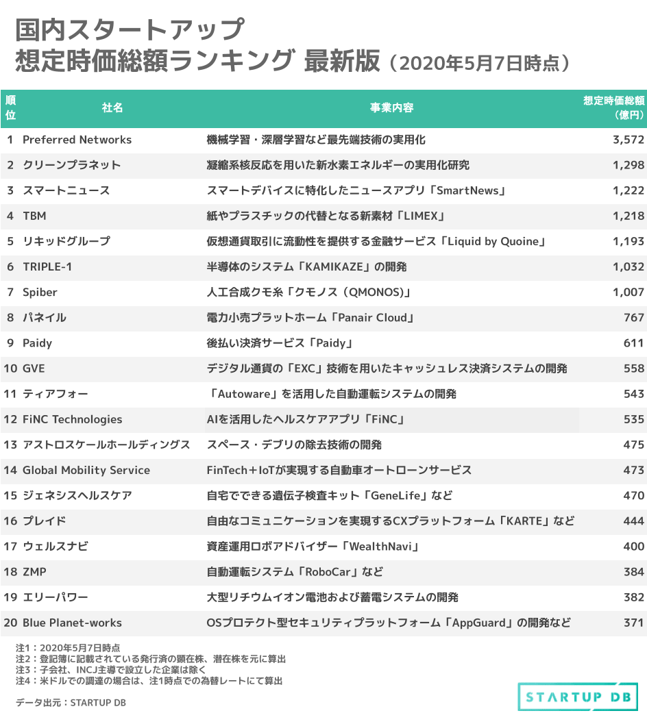 2020年5月の想定時価総額ランキングでは、5月3日に総額約2500万ドルの資金調達を実施した、フィンテックのGVEが10位に新規ランクイン。GVEは、英オックスフォード大学医学部小児科の特別戦略アドバイザーや、ミャンマー建国ファンドの最高経営責任者である房広治氏が代表を務める。同社は、中央銀行が発行するデジタル通貨の基盤となる安全性の高い技術"EXC"を使ったキャッシュレス決済のシステムの開発に特化した事業を展開する企業となっている。