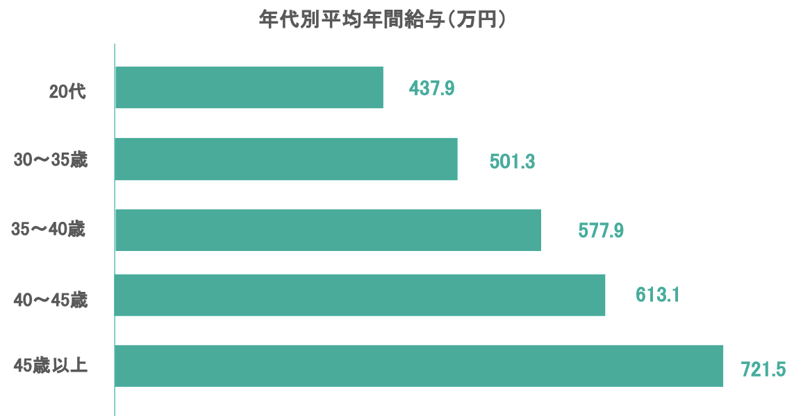 次に平均給与に影響しそうな要素である平均年齢と従業員数と合わせてみていく。まずは平均年齢(各企業の従業員全員の平均年齢)についてだ。従業員の平均年齢20代の企業が27社、30〜35歳の企業が68社、35〜40歳が47社、40〜45歳が17社、45歳以上が7社。また、それぞれの年代に該当した企業の平均年収は以下だった。