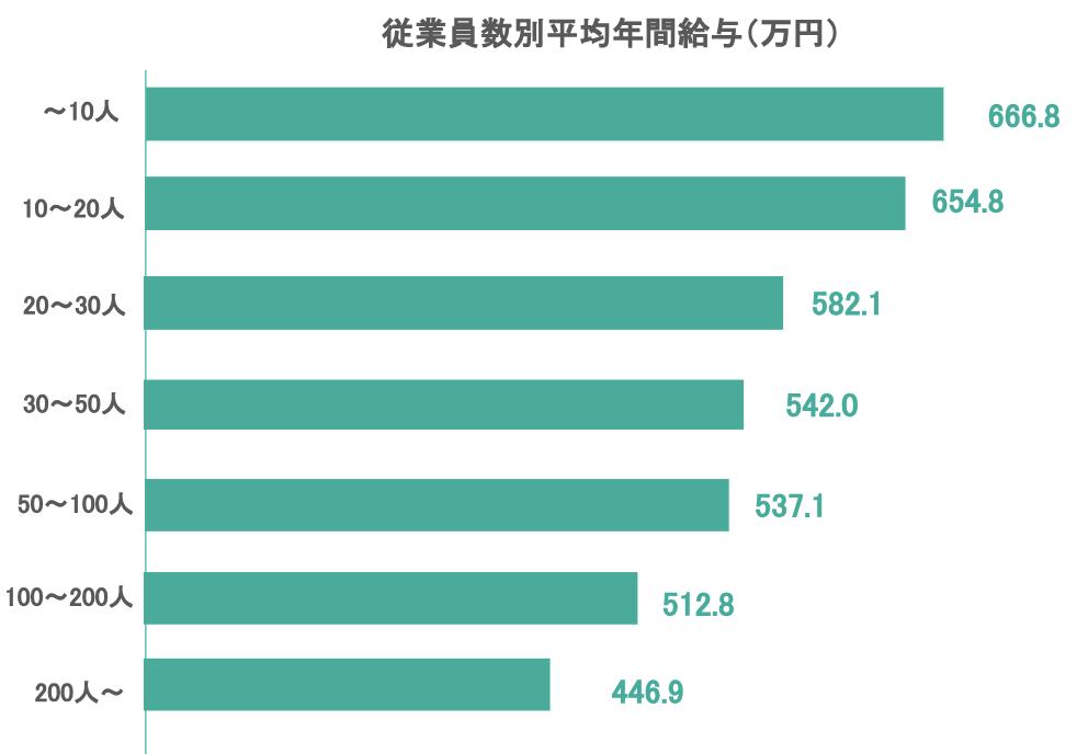 従業員別で見ると、従業員の数が多くなるほど平均給与は低くなるようだ。従業員数が10人未満の企業では、全てが平均給与を超えているなど、従業員数が一桁の企業は総じて平均給与が高いという傾向も見て取れた。