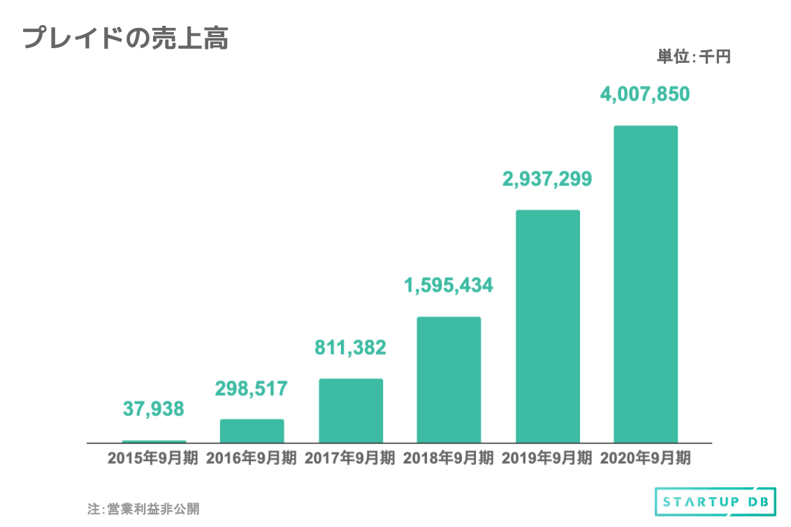 上図は過去5年間の売上高の推移である。2020年9月期の売上高は、2015年9月期の105倍にも成長しており、年々着実に成長していることがわかる。