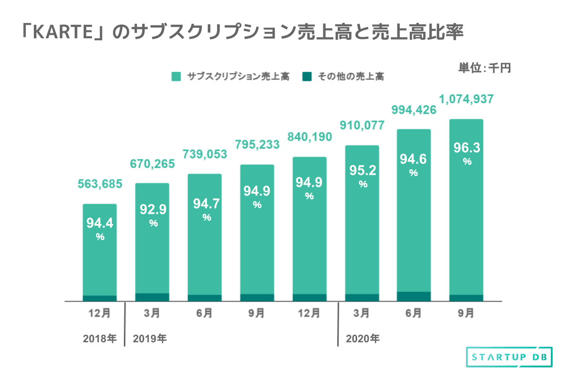 2020年9月期第4四半期のサブスクリプション売上高比率は、96.3%となっている。2018年9月期第1四半期から売上高比率90%以上を維持しており、SaaS事業における「KARTE」など各サービスは継続的に成長していることがわかる。