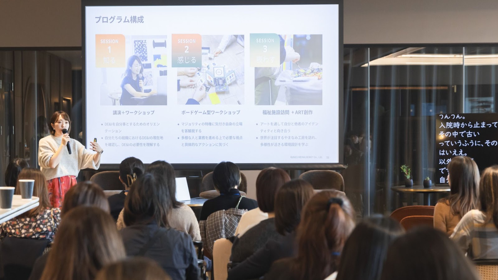 このプログラムは3つのフェーズに分かれていて、1つ目は講演会+ワークショップ、2つ目はボードゲーム型の体験学習、3つ目は福祉施設訪問・ART創作プログラム・DE&Iアクションプランの設計です。研修自体は、文部科学省で特別支援教育を推進している野口晃菜さんにアドバイザーとして入っていただき、ろう者のヘラルボニーの社員が中心となって開発しました」