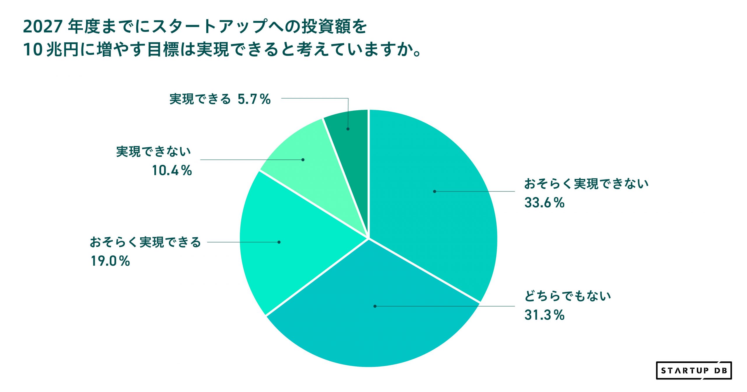 スタートアップへの投資額を2027年度に現在の10倍程度となる10兆円規模に引き上げるとする政府の目標について、スタートアップ企業や事業会社などに尋ねたところ、「実現できない」などの否定的な回答が4割を超えた。
