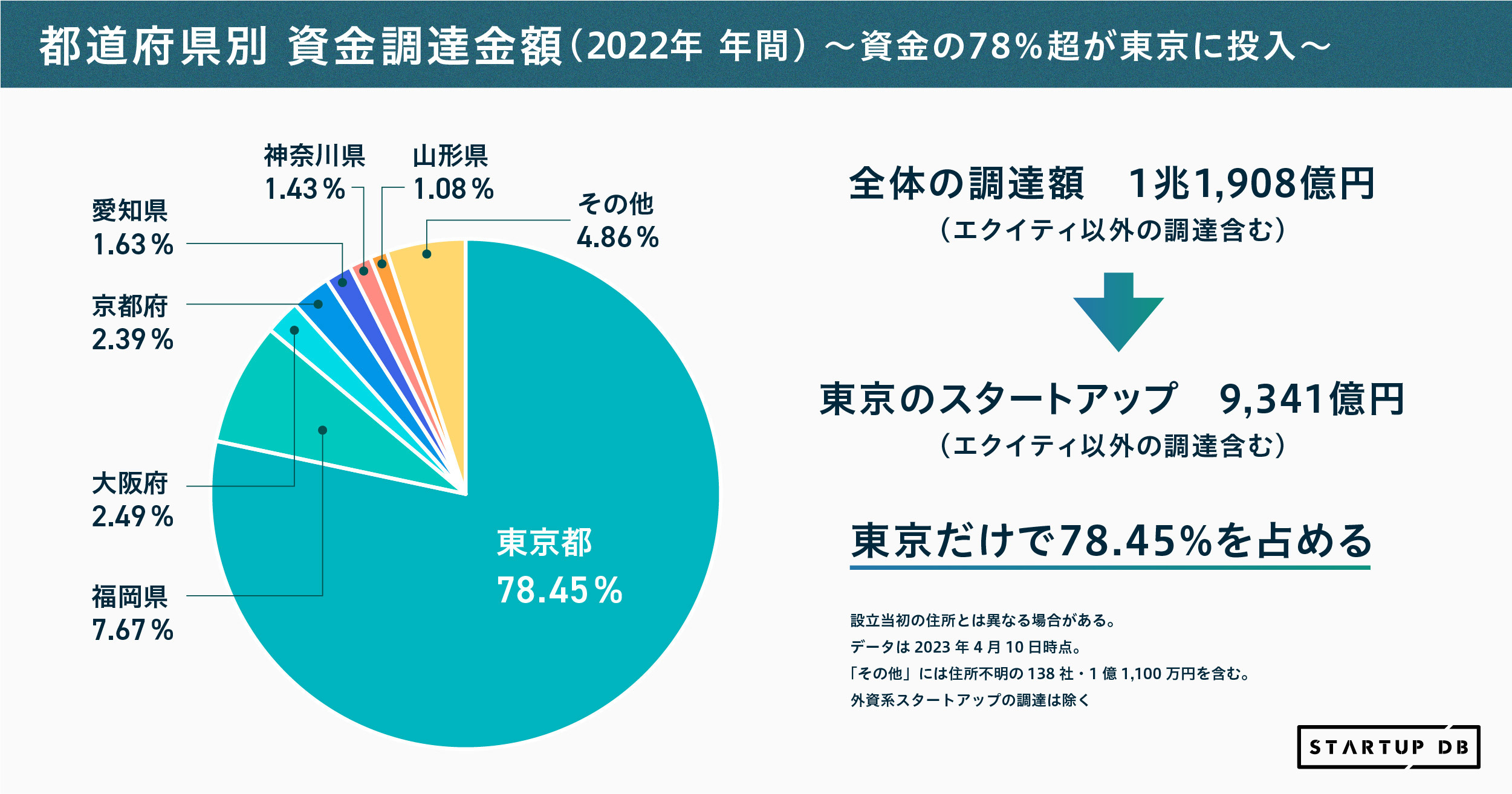 ただし、上述のように、金額で見た場合には東京のスタートアップが依然として78%(9,341億円)と大半を占めている。過去数年と比べてやや減少しているものの、大きな変化があるとは言い難い数字だ。