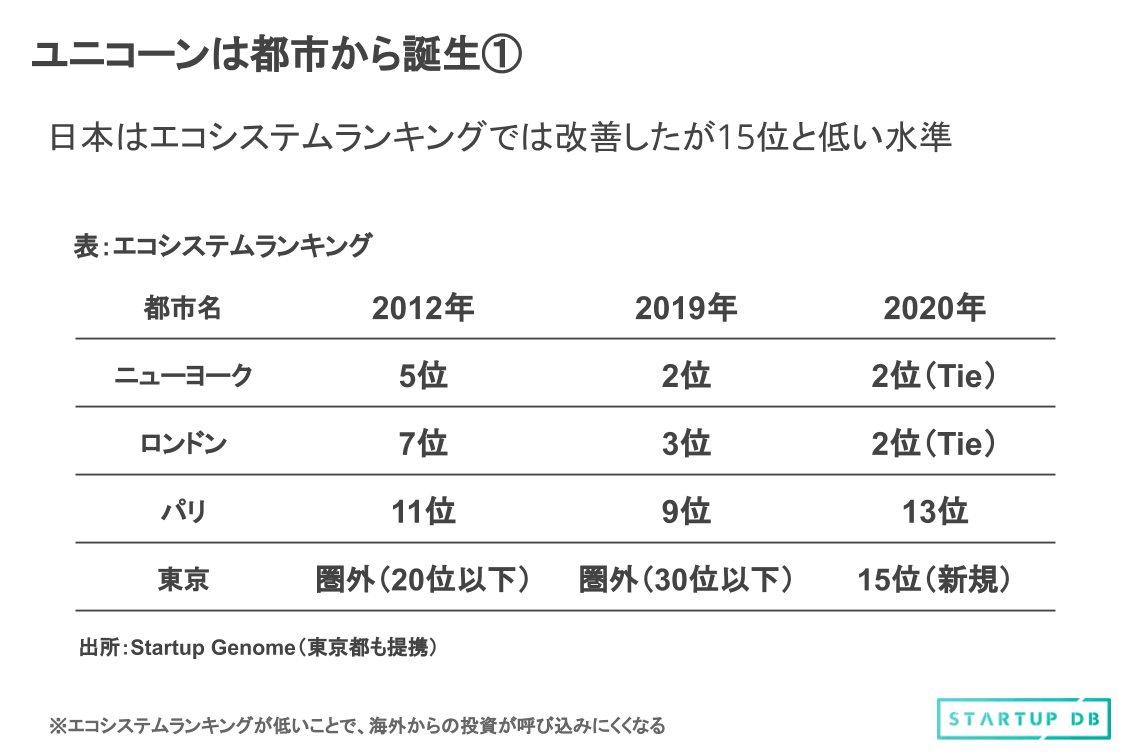 ・リーマンショックの後、新たな産業を興し、雇用や経済を回復させるためにニューヨーク、ロンドンではスタートアップ支援策を強化した。結果的にこの2都市は世界有数のスタートアップハブへと成長し、エコシステムランキングが上昇した(下図)。