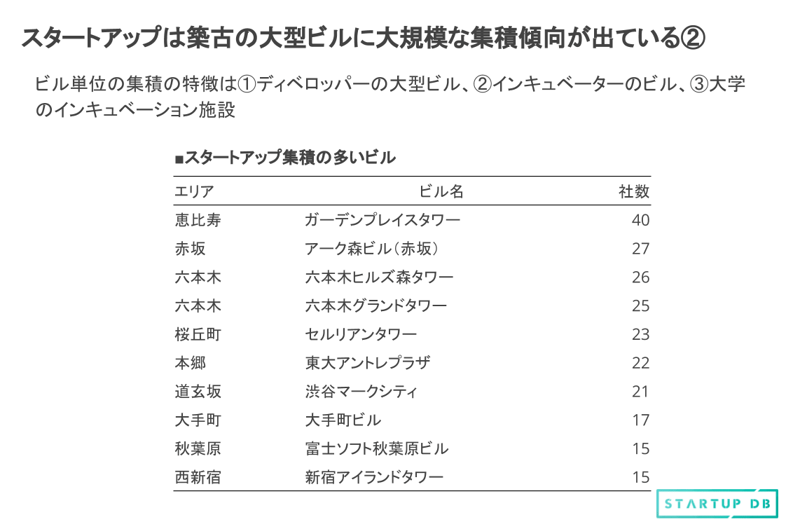 ・スタートアップは都心のごく限られたエリアに立地:都心エリアに強い集積(グローバルモランIは0.6)。特に渋谷・赤坂・六本木では、ビル単位で高度に集積(ロンドン、ボストンと似た傾向)。