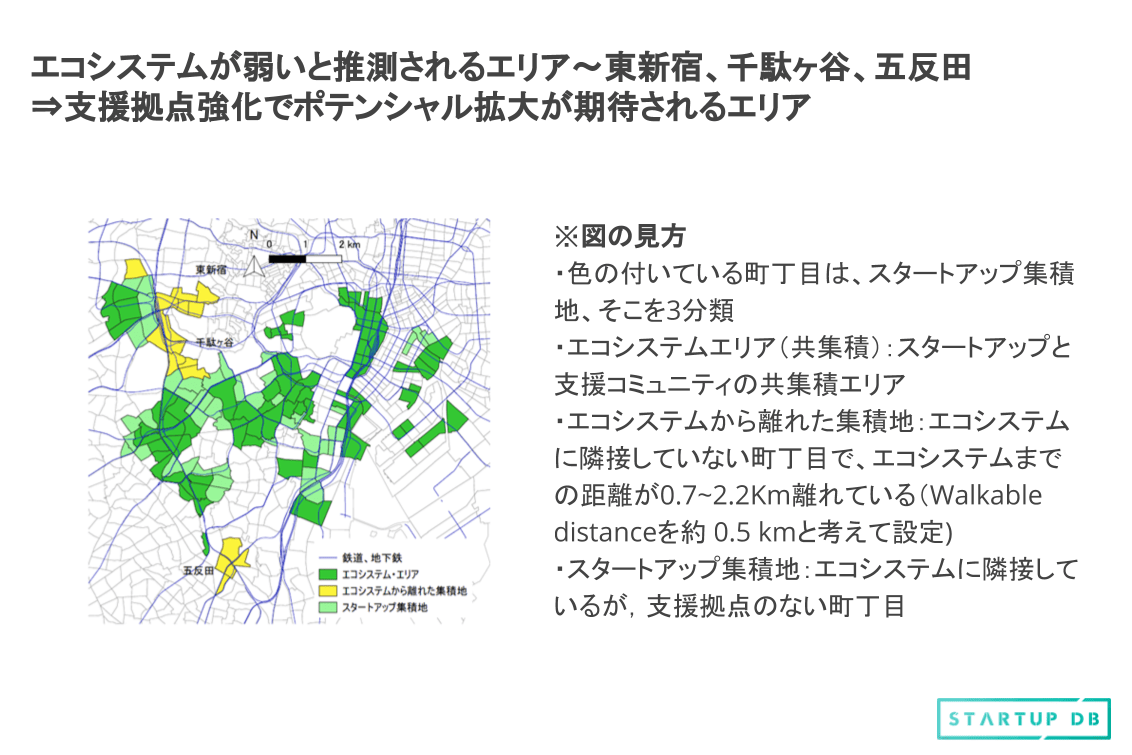 ・見えてきた課題と支援策、ポテンシャルエリアは?:スタートアップの集積があり、ホットスポットになっているにも関わらず、支援機関が少ないのでエコシステムのホットスポットになっていないエリアがある。このようなエリアに対しては公的支援拠点、民間の支援拠点を設置することでよりコミュニティが強化され、スタートアップの成長が促進される可能性が考えられる。例えば、五反田、新宿(東新宿)、千駄ヶ谷など。