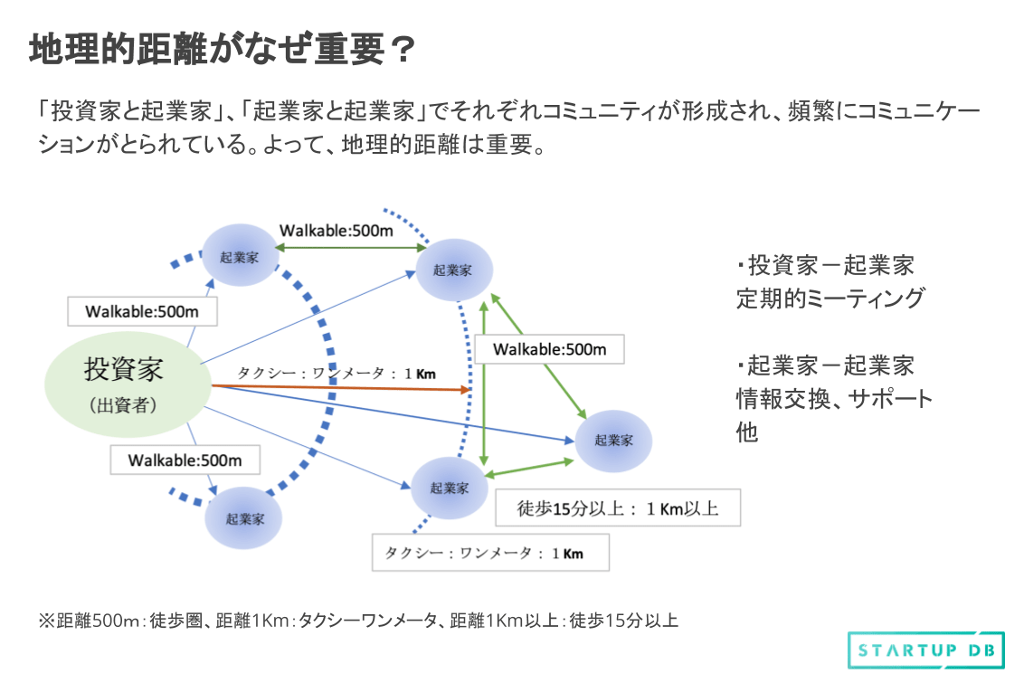 ・コミュニティの構成メンバー、地理的距離が情報のやり取り、資金提供、営業取引に影響する。