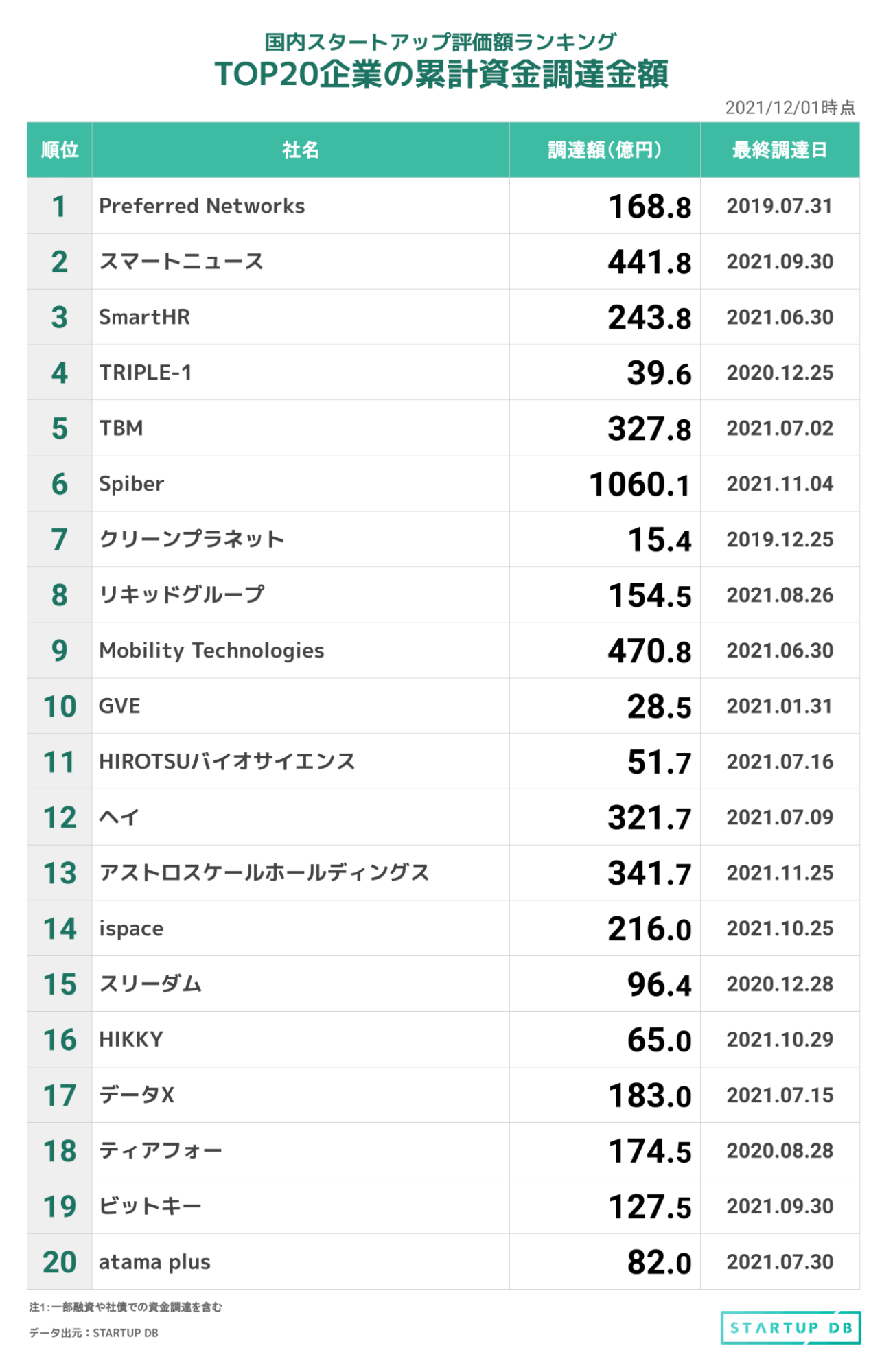 2021年12月の国内スタートアップ評価額ランキングでは、HIKKYが16位に新規ランクインを果たした他、Spiberが9位から6位に浮上し、atama plusが10月以来1ヶ月ぶりに20位にランクインした。