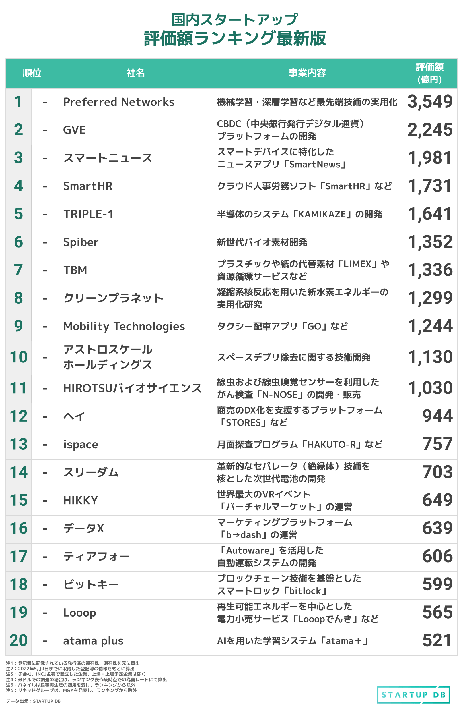 ランキング自体は先月とほぼ変化はなかったものの、スペースデブリ(宇宙ごみ、デブリ)除去サービスの開発に取り組むアストロスケールホールディングスの評価額が69億円上昇した。同社は米ドルでの調達をしており、先月の評価額算出時点から円安が進んだことが要因である。先月同様、日本で評価額1,000億円を超えるスタートアップは11社だ。